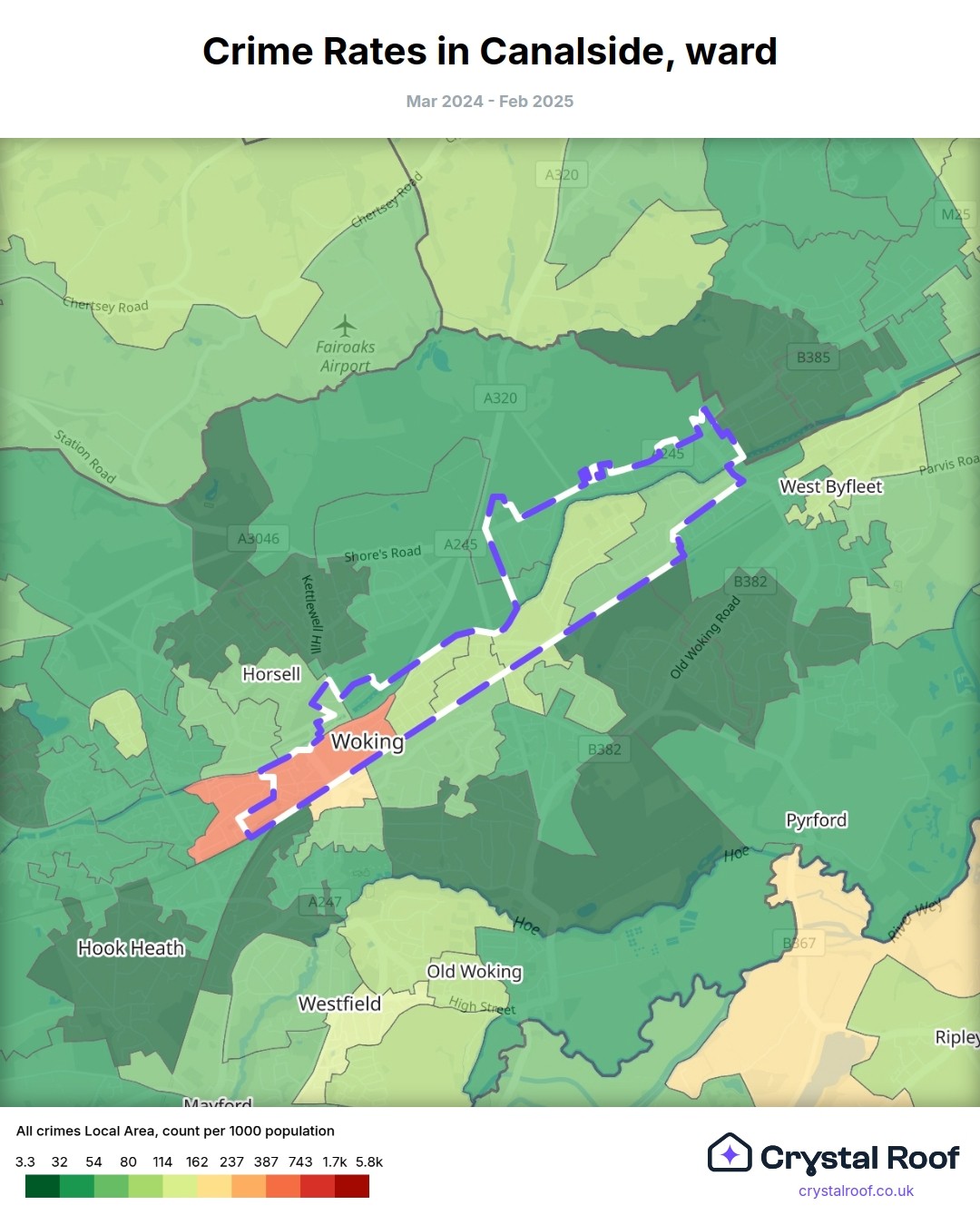 Canalside (ward) is located within Woking (borough). Annual total crime rate in Woking (borough) is 75.6 crimes per thousand resident population, which can be rated as 3 out of 10 or low crime level compared to other local authority districts in England and Wales.