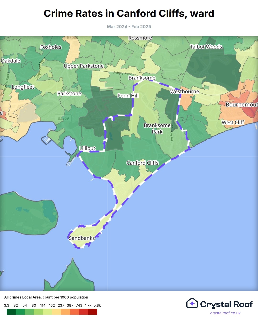 Canford Cliffs, (ward) includes areas with the following crime ratings (see map):