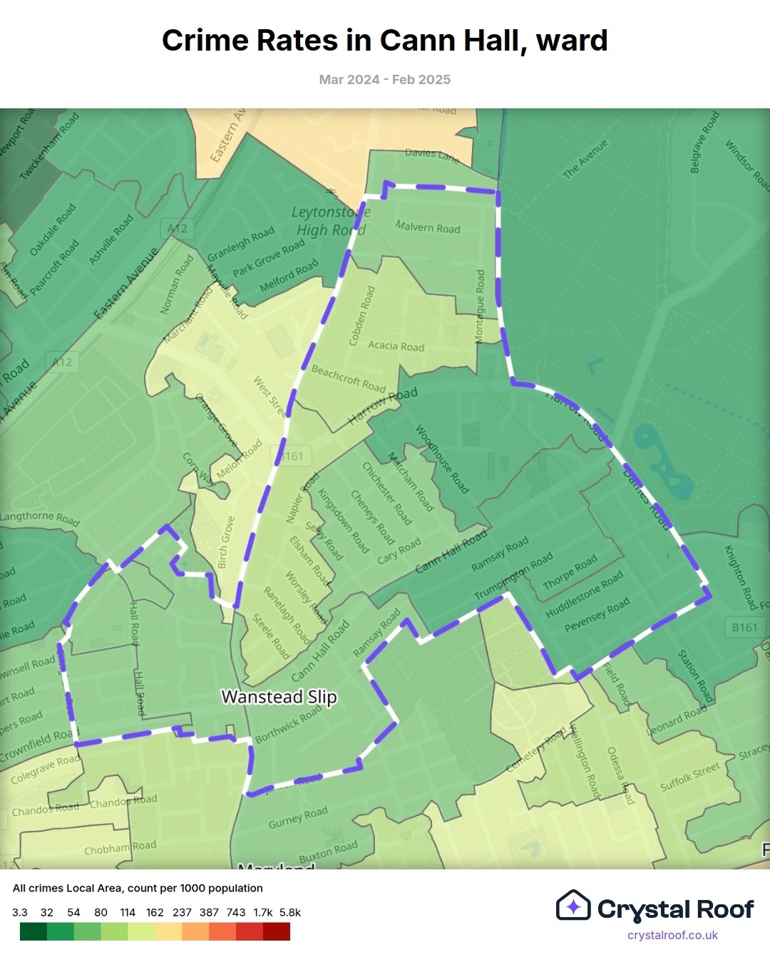 Cann Hall, (ward) includes areas with the following crime ratings (see map):