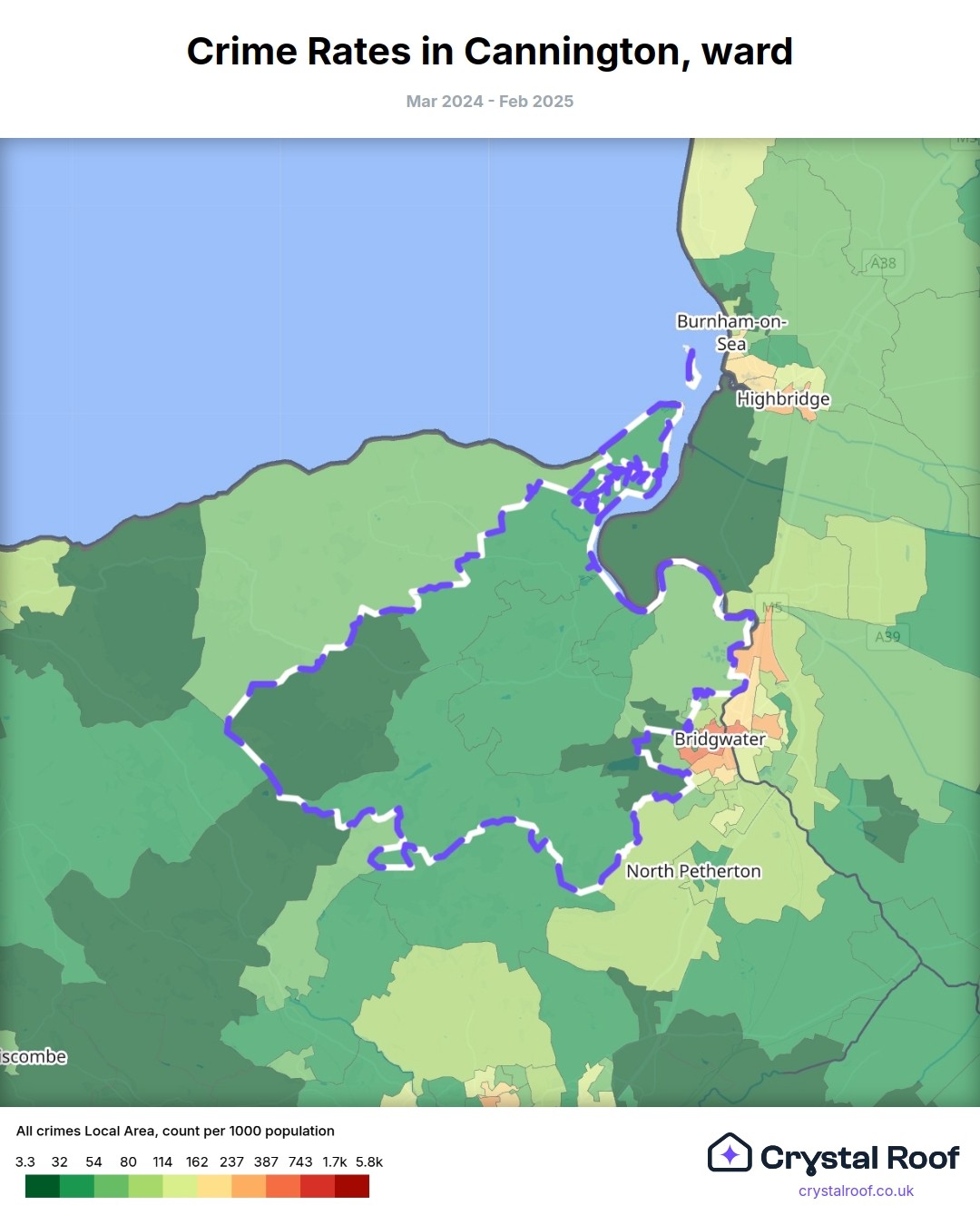 Cannington (ward) is located within Somerset (borough). Annual total crime rate in Somerset (borough) is 88 crimes per thousand resident population, which can be rated as 4 out of 10 or low crime level compared to other local authority districts in England and Wales.