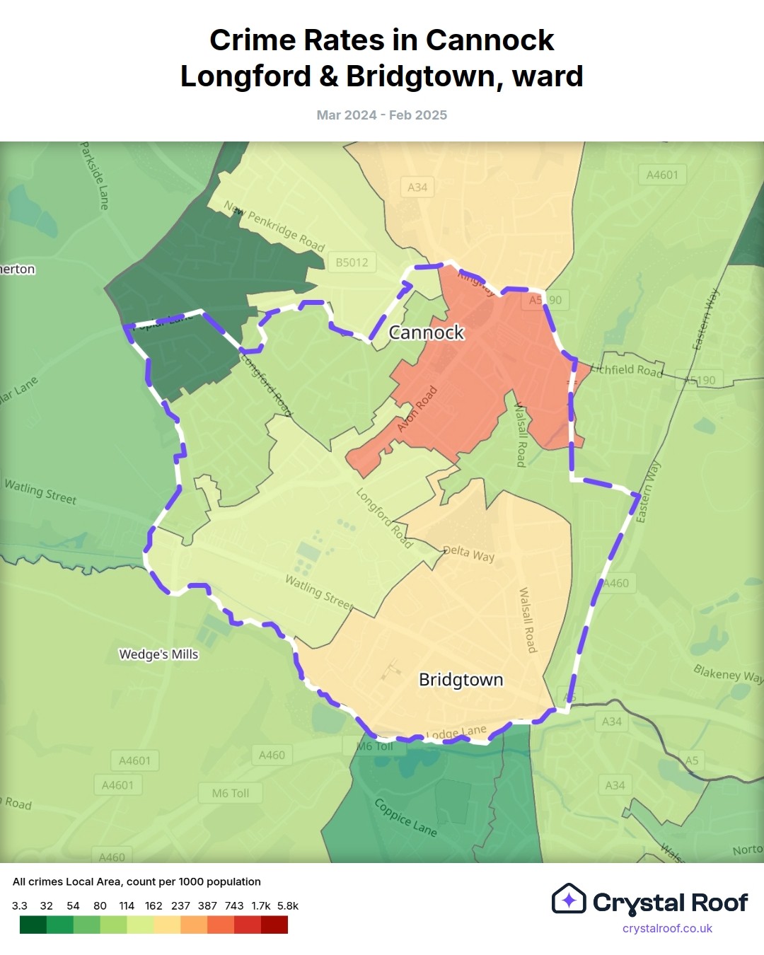 Cannock Longford & Bridgtown, (ward) includes areas with the following crime ratings (see map):