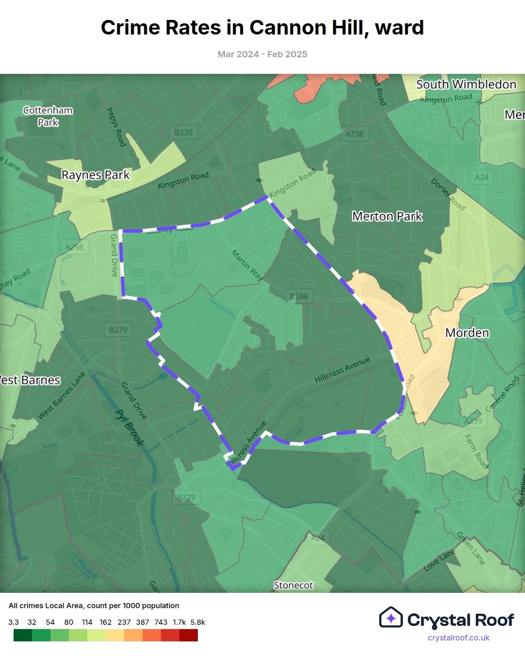 Cannon Hill (ward) is located within Merton (borough). Annual total crime rate in Merton (borough) is 79.7 crimes per thousand resident population, which can be rated as 3 out of 10 or low crime level compared to other local authority districts in England and Wales.