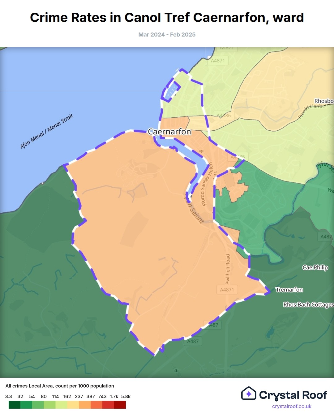 Canol Tref Caernarfon, (ward) includes areas with the following crime ratings (see map):