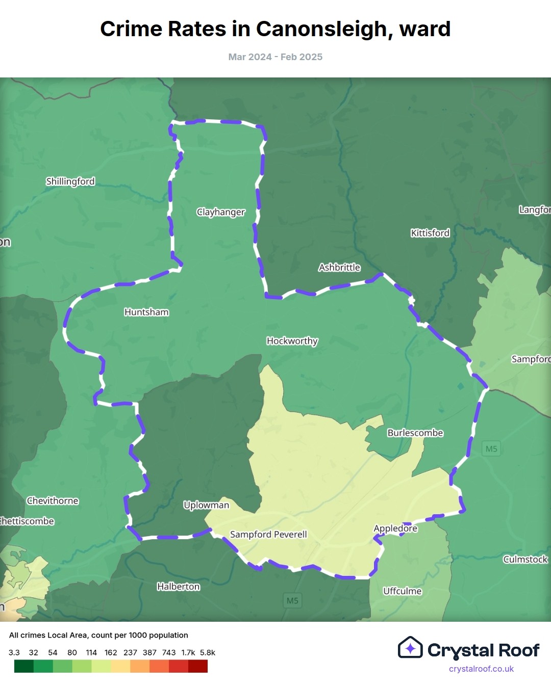 Canonsleigh (ward) is located within Mid Devon (borough). Annual total crime rate in Mid Devon (borough) is 64.4 crimes per thousand resident population, which can be rated as 2 out of 10 or low crime level compared to other local authority districts in England and Wales.