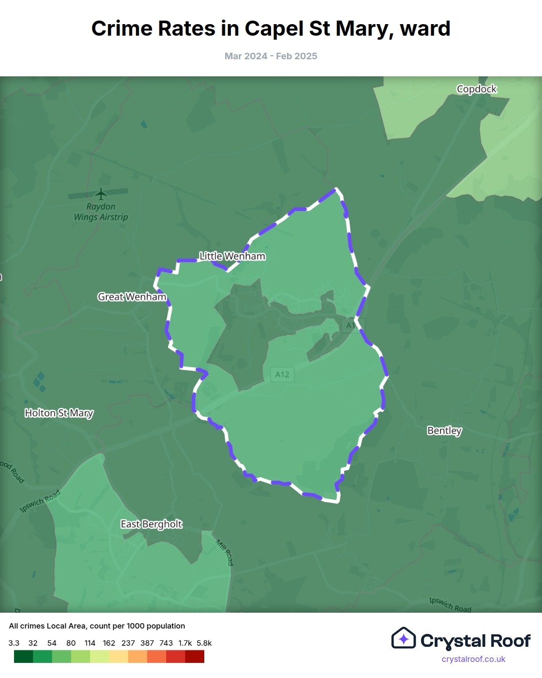 Capel St Mary, (ward) includes areas with the following crime ratings (see map):