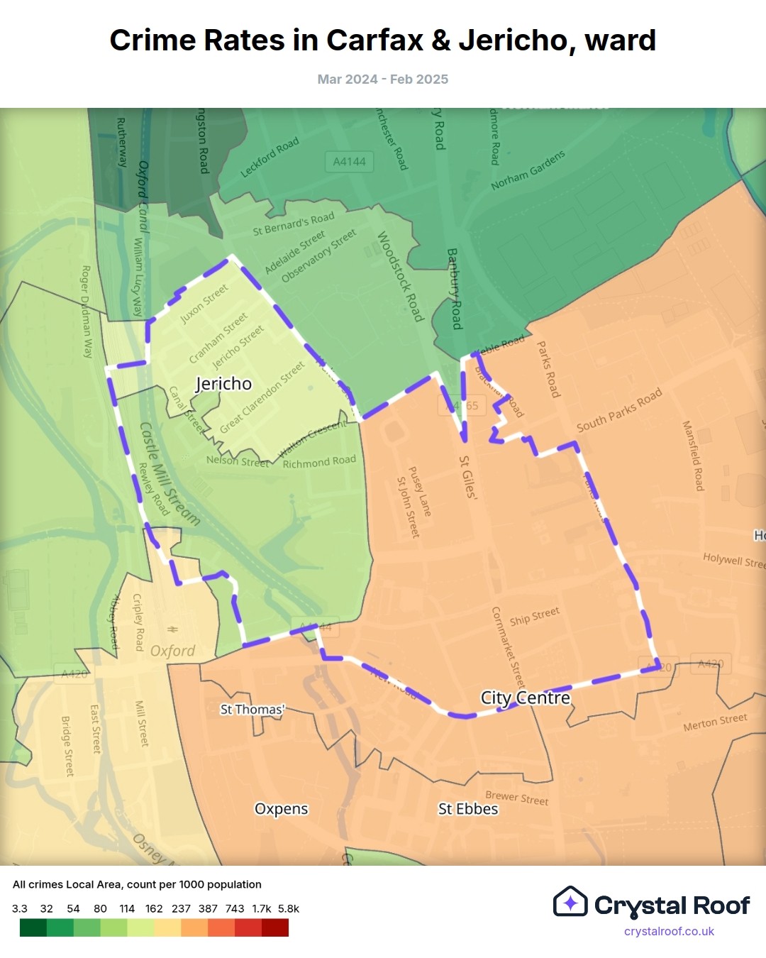 The figures in grey indicate the relative ratings of Carfax & Jericho (ward) for a specific crime type compared to other wards in England and Wales.