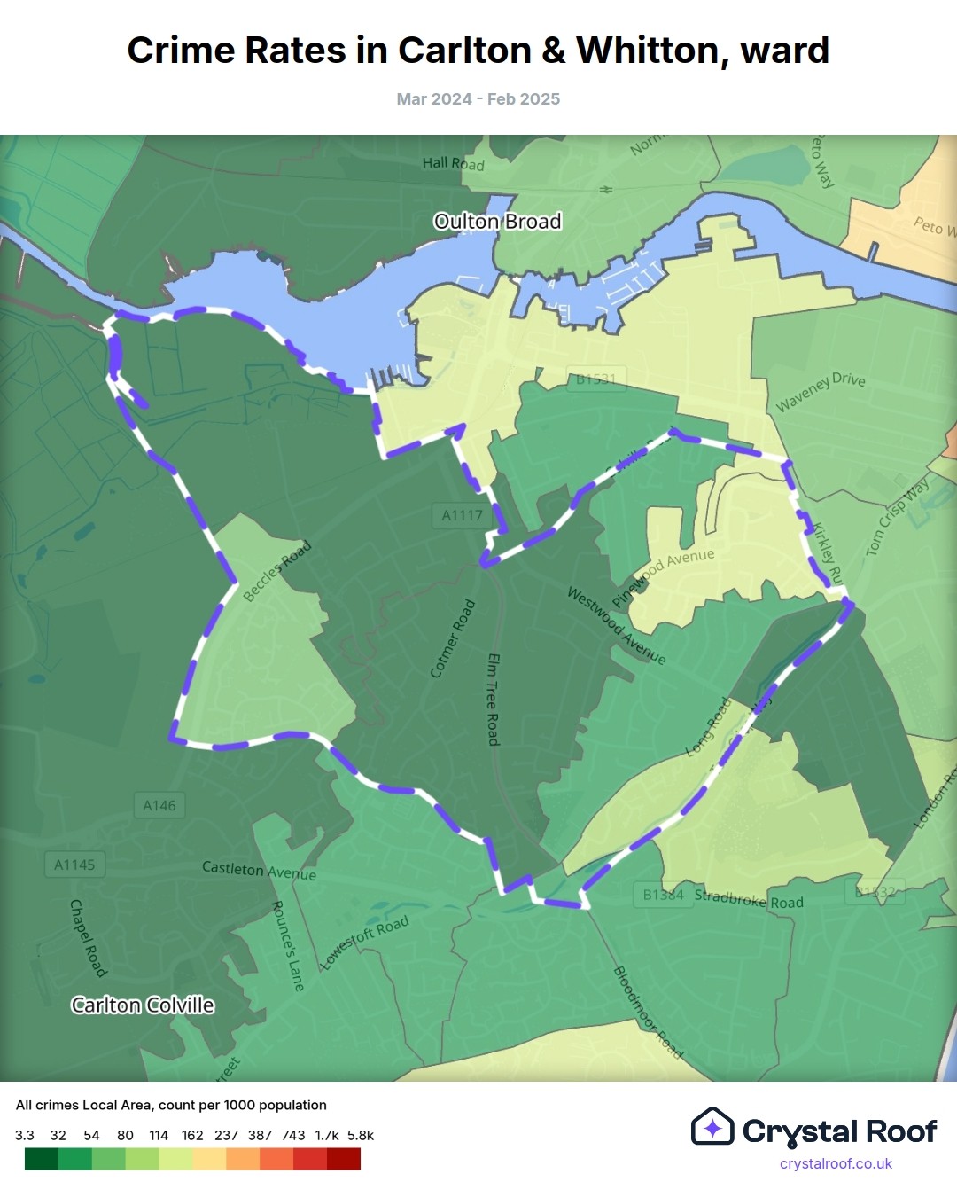 Carlton & Whitton (ward) is located within East Suffolk (borough). Annual total crime rate in East Suffolk (borough) is 57 crimes per thousand resident population, which can be rated as 1 out of 10 or low crime level compared to other local authority districts in England and Wales.