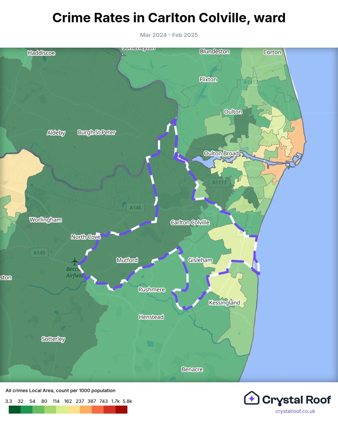 Carlton Colville, (ward) includes areas with the following crime ratings (see map):