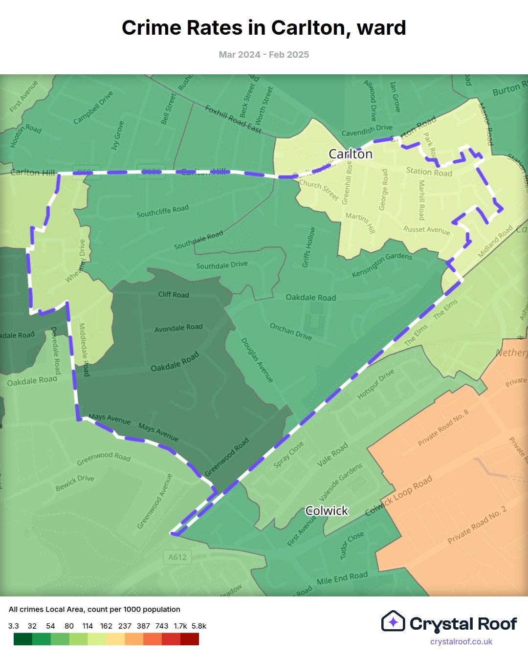 Carlton, (ward) includes areas with the following crime ratings (see map):