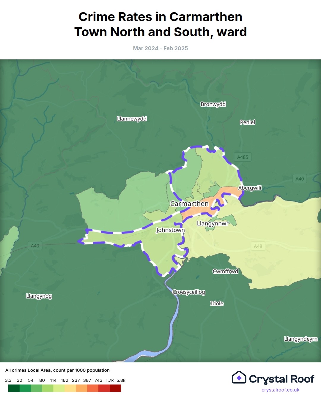 Carmarthen Town North and South, (ward) includes areas with the following crime ratings (see map):