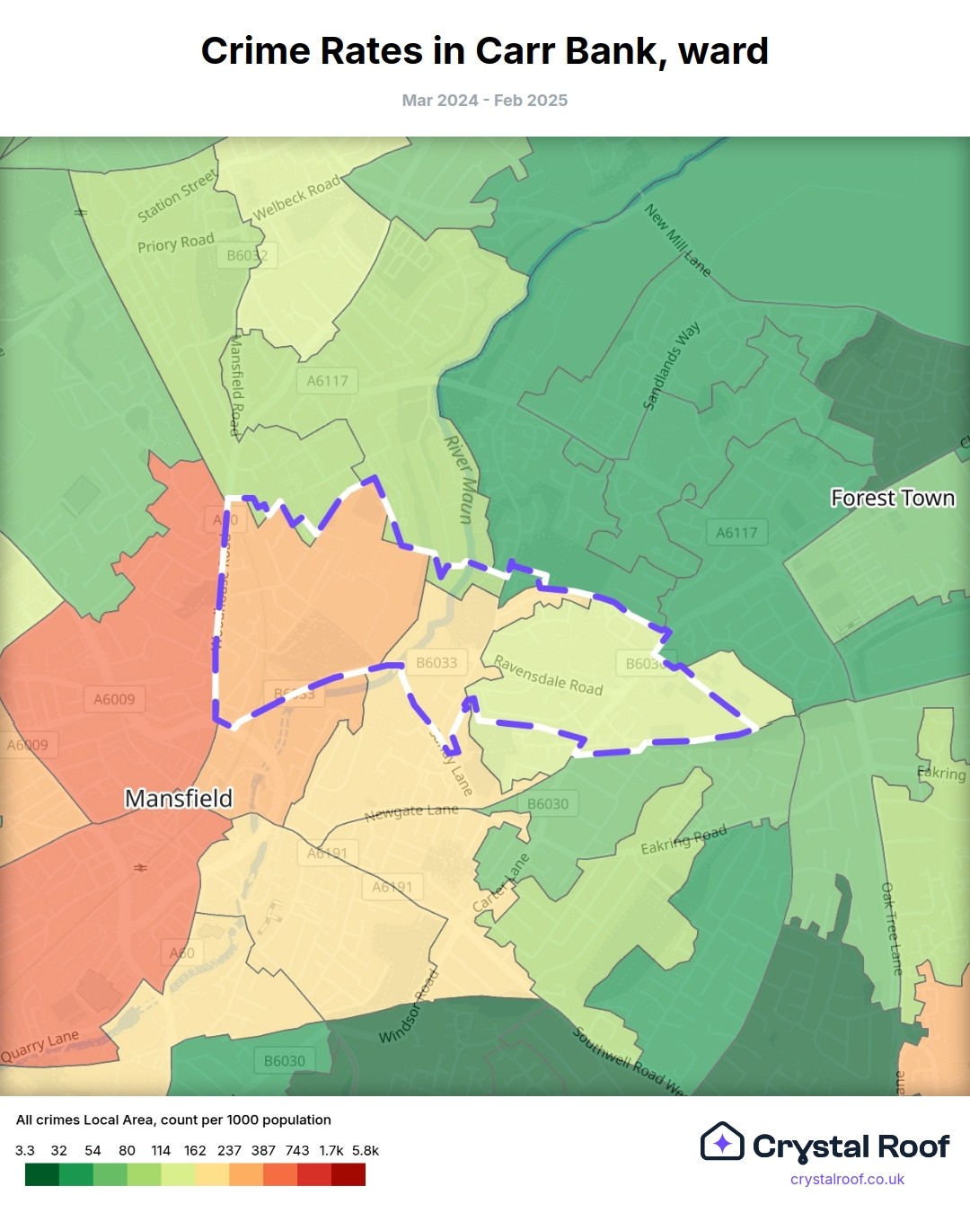 Carr Bank (ward) is located within Mansfield (borough). Annual total crime rate in Mansfield (borough) is 114 crimes per thousand resident population, which can be rated as 5 out of 10 or medium crime level compared to other local authority districts in England and Wales.