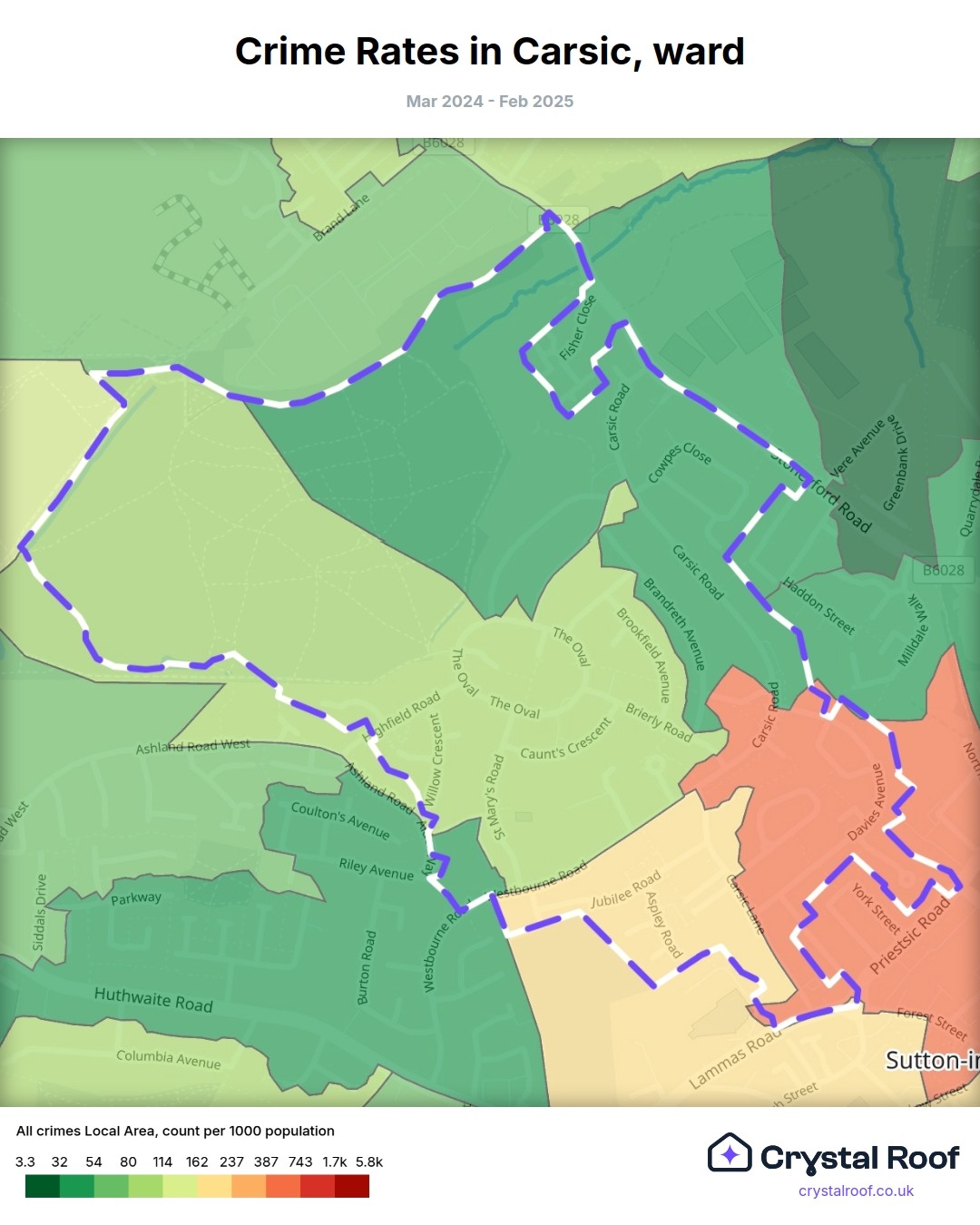 Carsic, (ward) includes areas with the following crime ratings (see map):