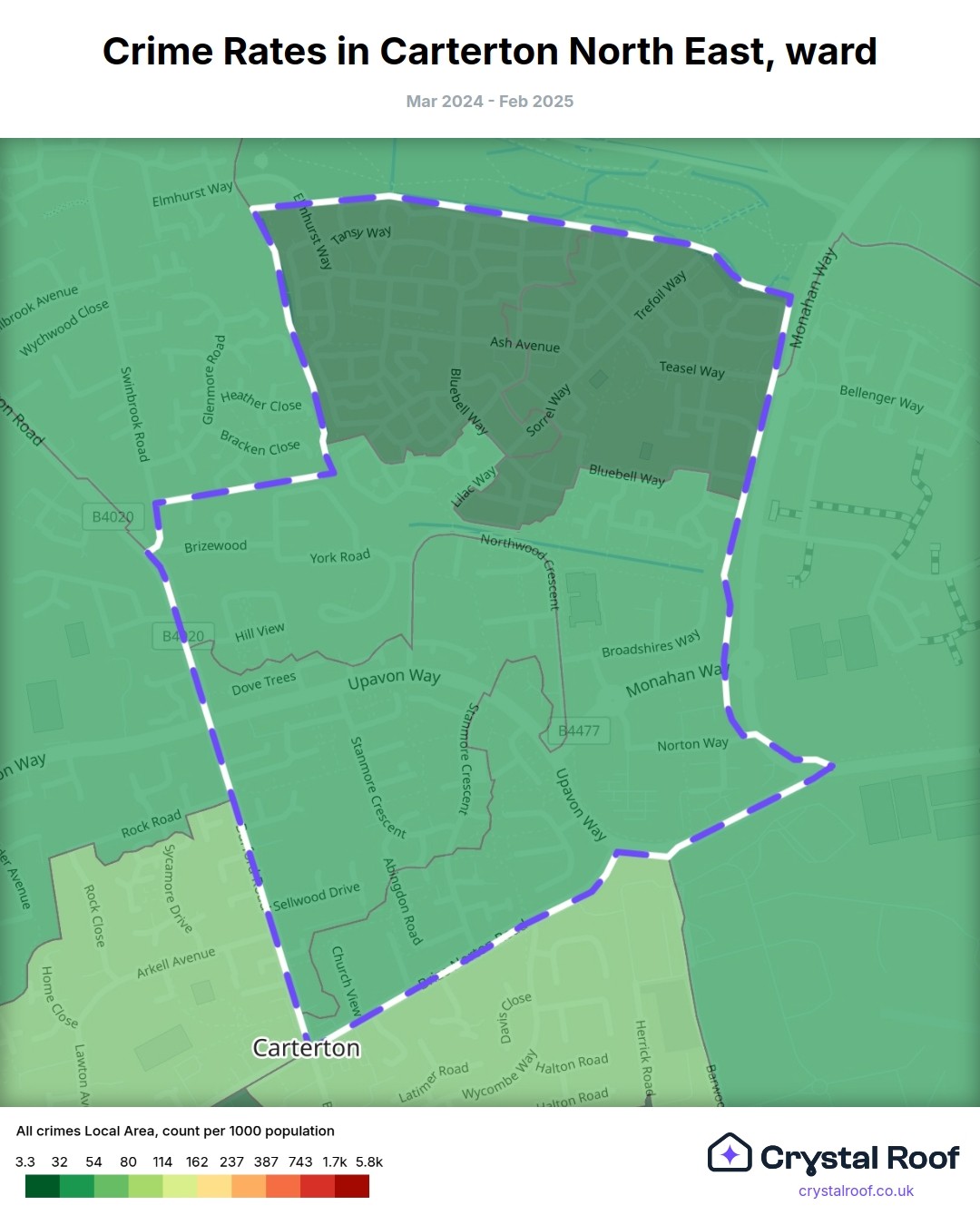 The figures in grey indicate the relative ratings of Carterton North East (ward) for a specific crime type compared to other wards in England and Wales.