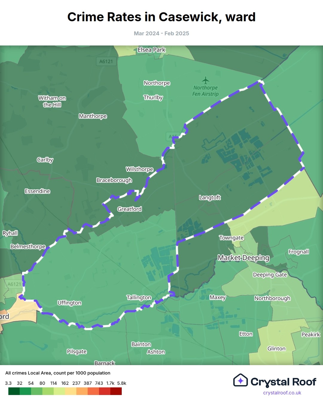 The figures in grey indicate the relative ratings of Casewick (ward) for a specific crime type compared to other wards in England and Wales.