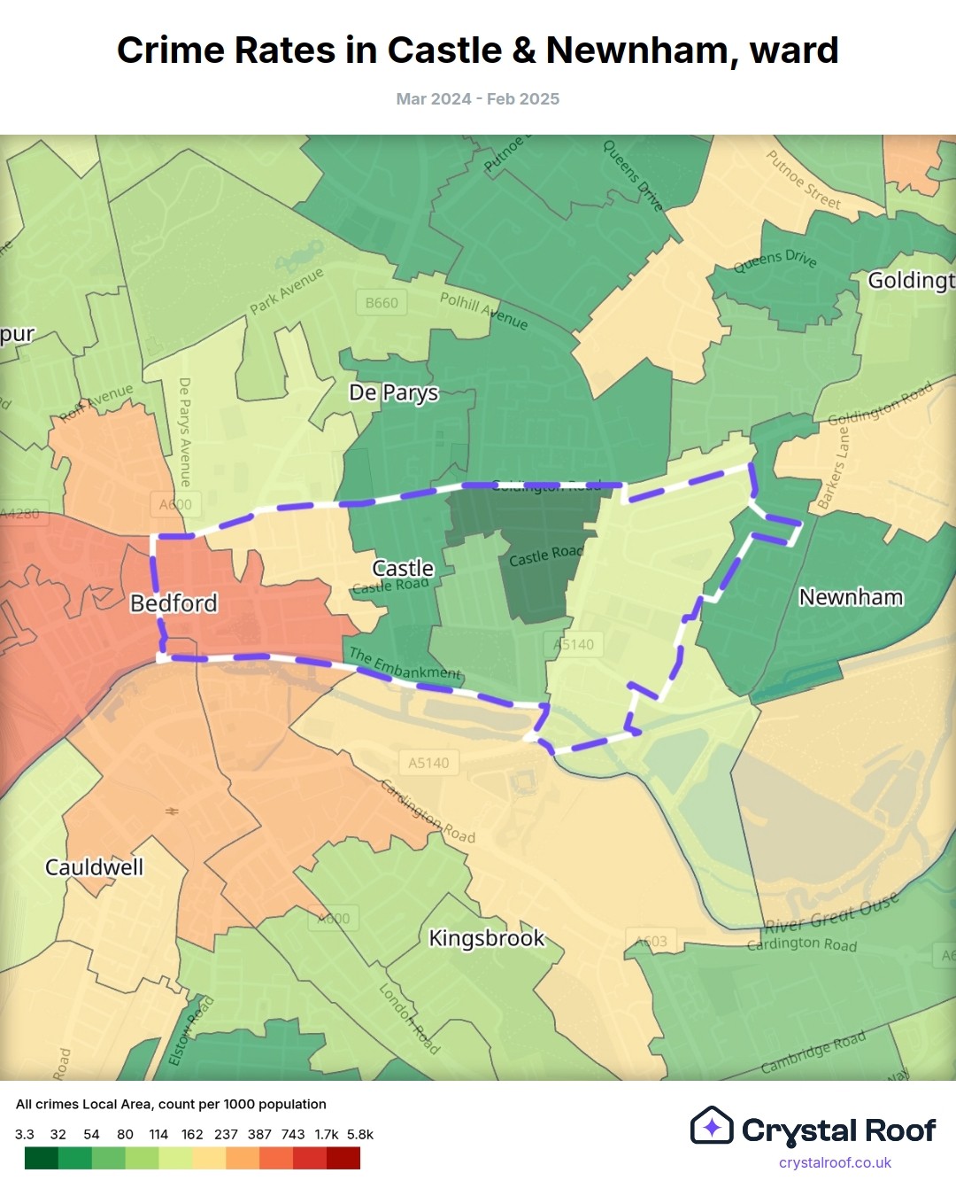 Castle & Newnham (ward) is located within Bedford (borough). Annual total crime rate in Bedford (borough) is 96.2 crimes per thousand resident population, which can be rated as 4 out of 10 or low crime level compared to other local authority districts in England and Wales.