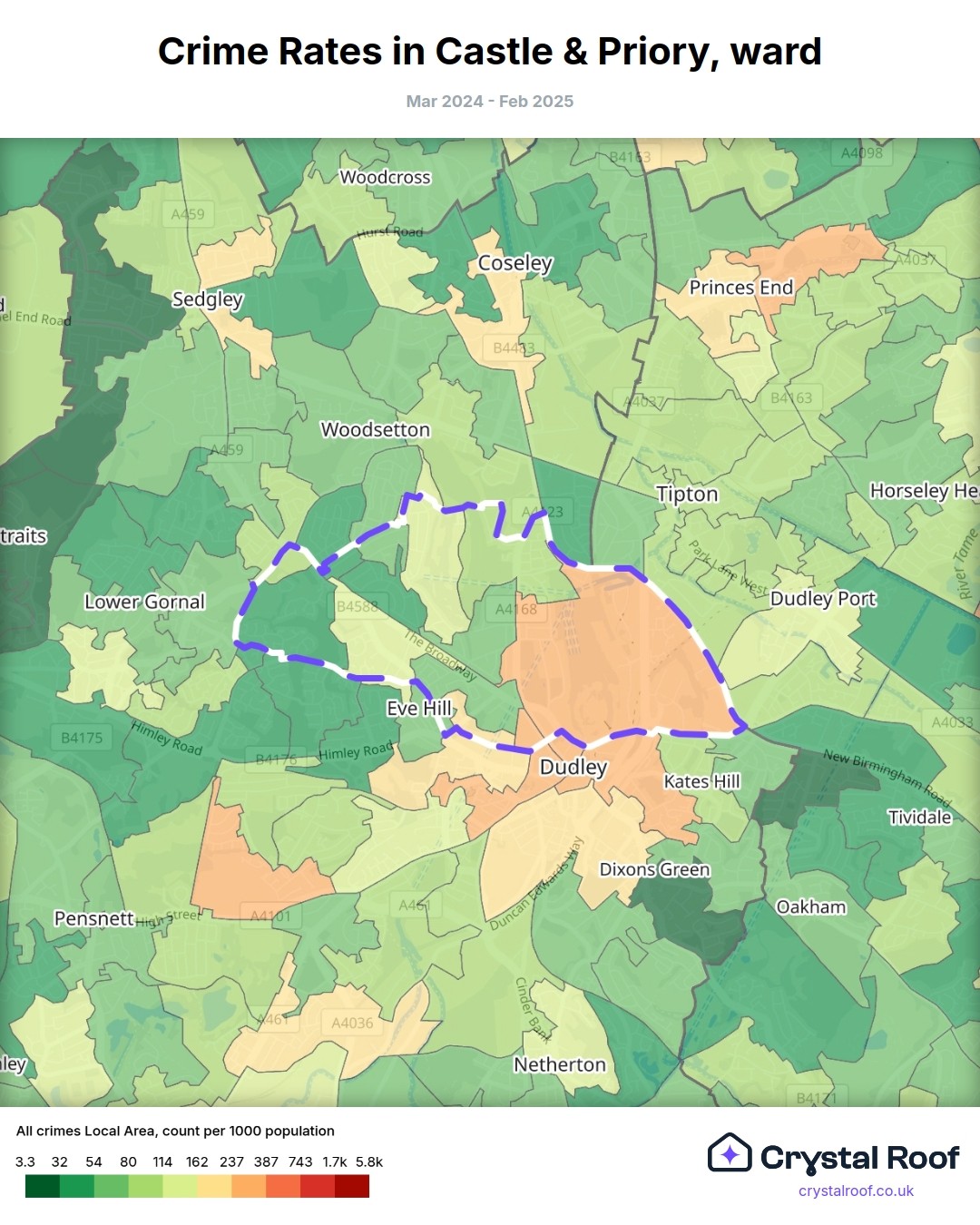 Castle & Priory, (ward) includes areas with the following crime ratings (see map):