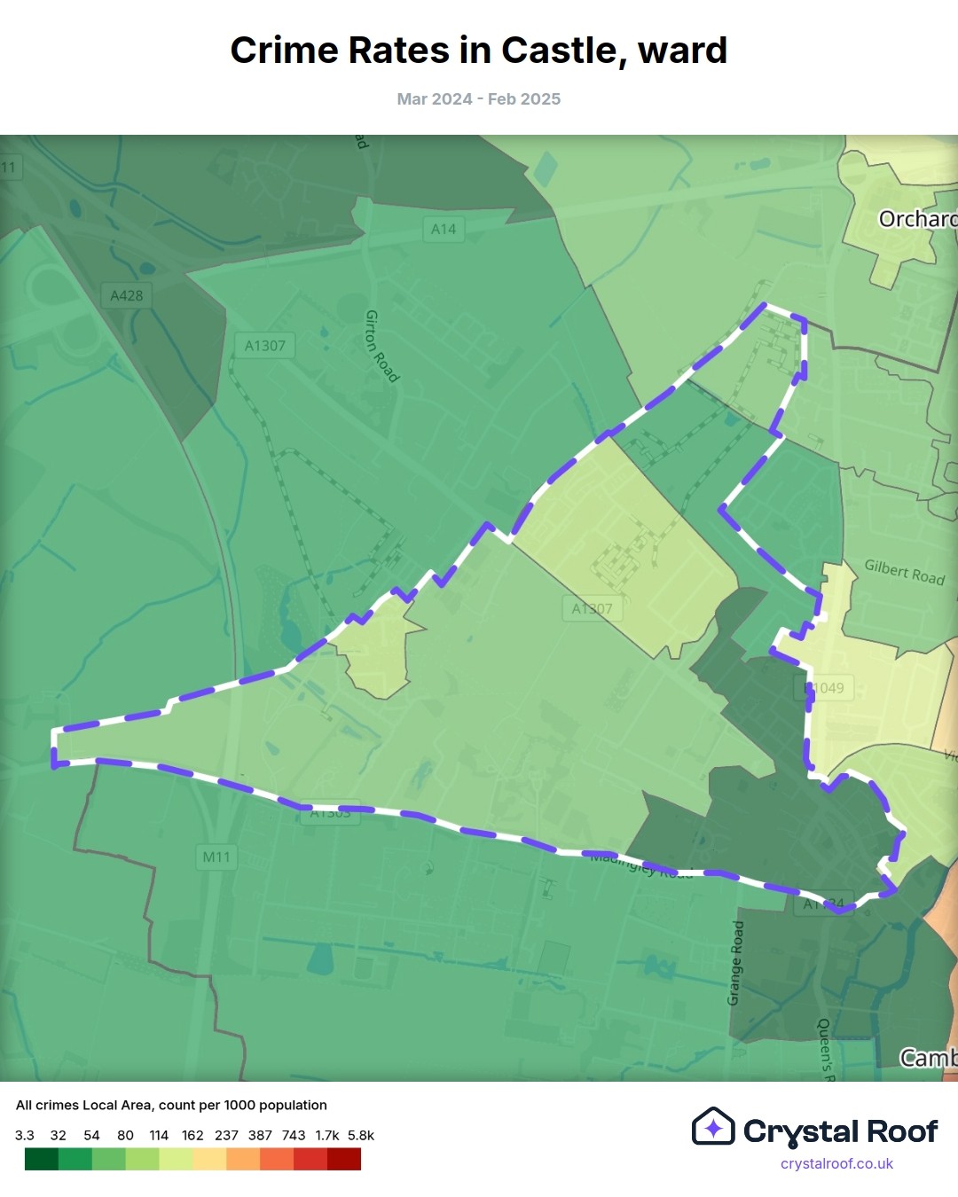 Castle (ward) is located within Cambridge (borough). Annual total crime rate in Cambridge (borough) is 113 crimes per thousand resident population, which can be rated as 5 out of 10 or medium crime level compared to other local authority districts in England and Wales.