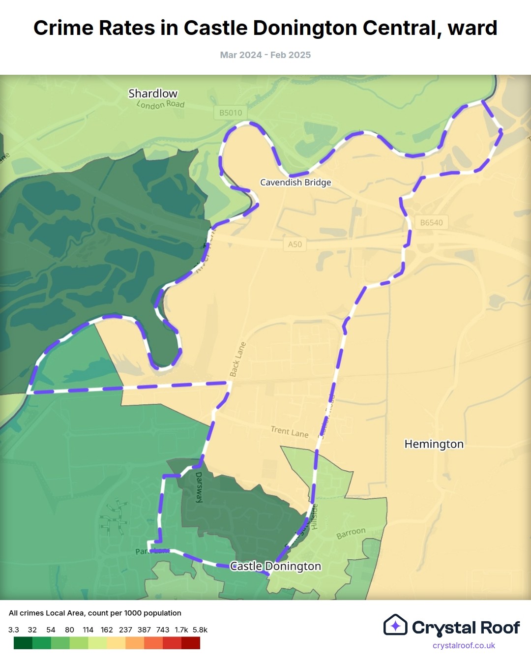The figures in grey indicate the relative ratings of Castle Donington Central (ward) for a specific crime type compared to other wards in England and Wales.