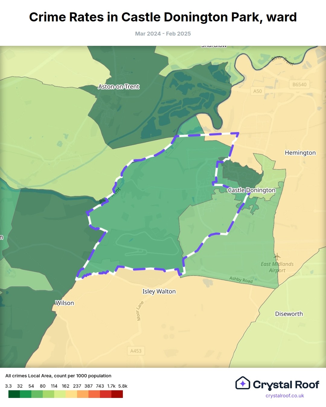 The figures in grey indicate the relative ratings of Castle Donington Park (ward) for a specific crime type compared to other wards in England and Wales.