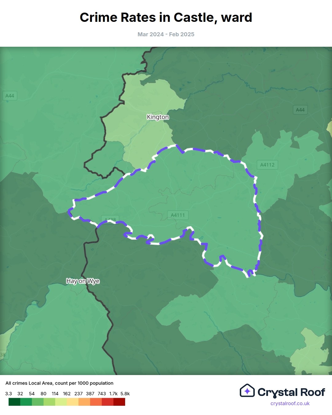 Castle (ward) is located within Herefordshire, County of (borough). Annual total crime rate in Herefordshire, County of (borough) is 63.5 crimes per thousand resident population, which can be rated as 2 out of 10 or low crime level compared to other local authority districts in England and Wales.
