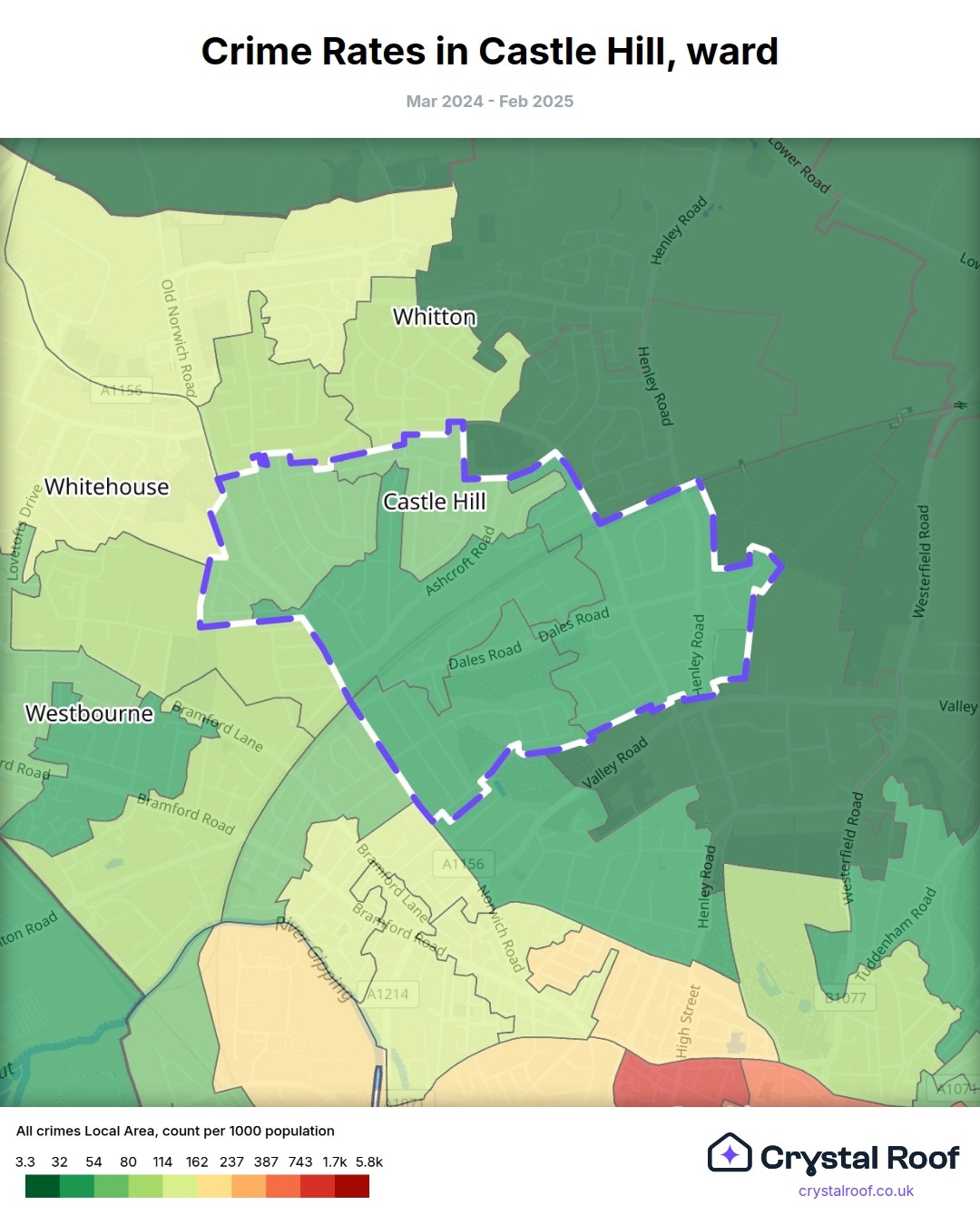 The figures in grey indicate the relative ratings of Castle Hill (ward) for a specific crime type compared to other wards in England and Wales.