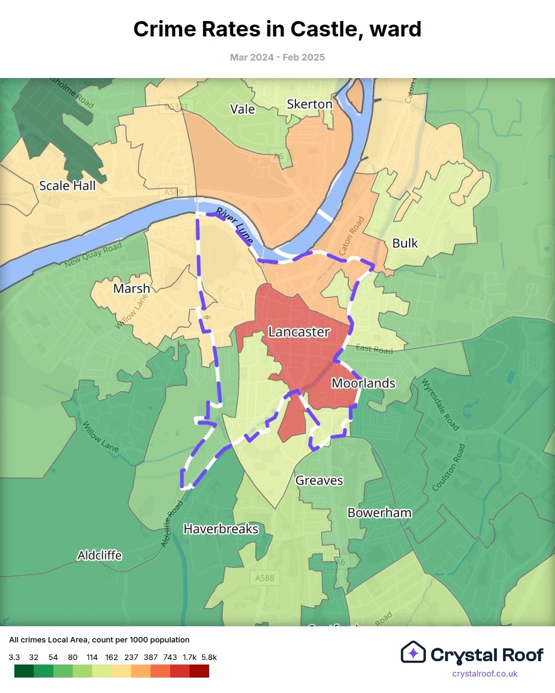 Castle (ward) is located within Lancaster (borough). Annual total crime rate in Lancaster (borough) is 109 crimes per thousand resident population, which can be rated as 5 out of 10 or medium crime level compared to other local authority districts in England and Wales.