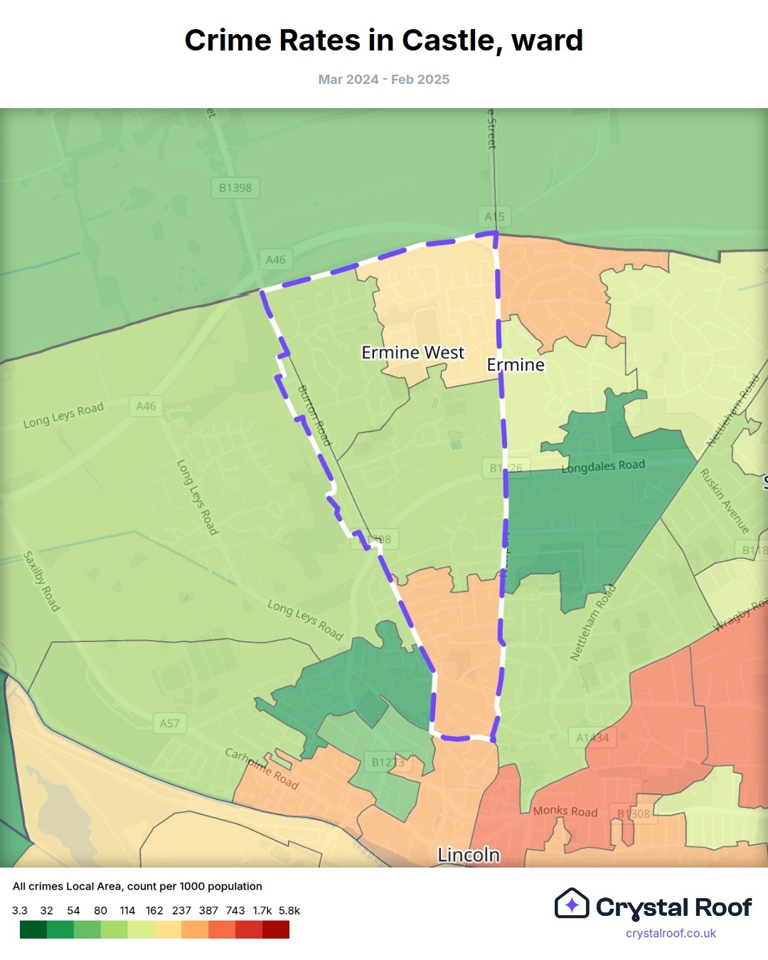 Castle (ward) is located within Lincoln (borough). Annual total crime rate in Lincoln (borough) is 158 crimes per thousand resident population, which can be rated as 7 out of 10 or high crime level compared to other local authority districts in England and Wales.