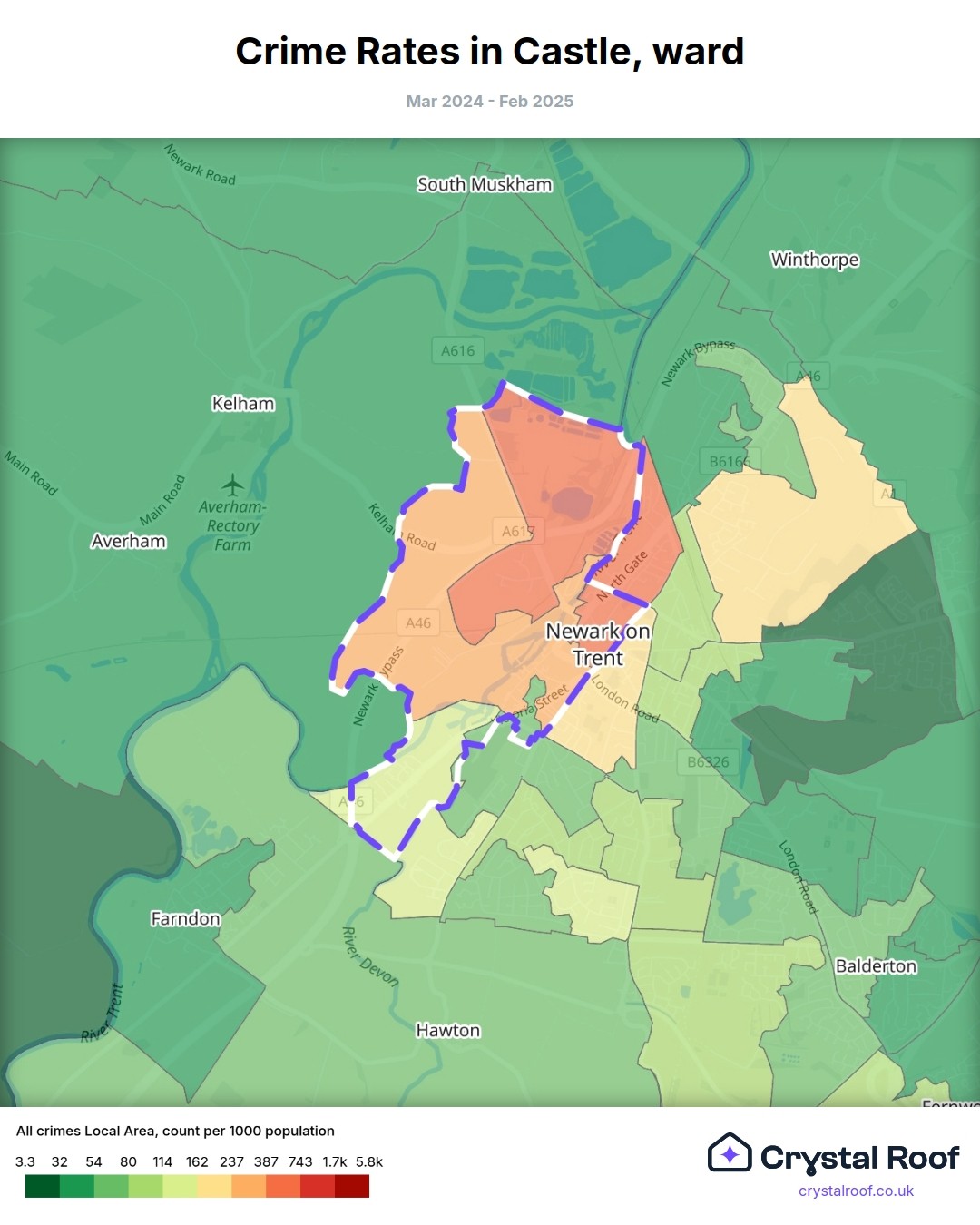 Castle (ward) is located within Newark and Sherwood (borough). Annual total crime rate in Newark and Sherwood (borough) is 86.1 crimes per thousand resident population, which can be rated as 4 out of 10 or low crime level compared to other local authority districts in England and Wales.