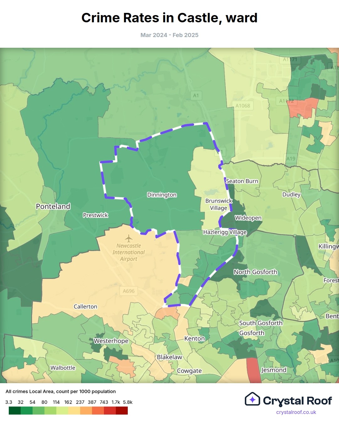 Castle (ward) is located within Newcastle upon Tyne (borough). Annual total crime rate in Newcastle upon Tyne (borough) is 148 crimes per thousand resident population, which can be rated as 7 out of 10 or high crime level compared to other local authority districts in England and Wales.