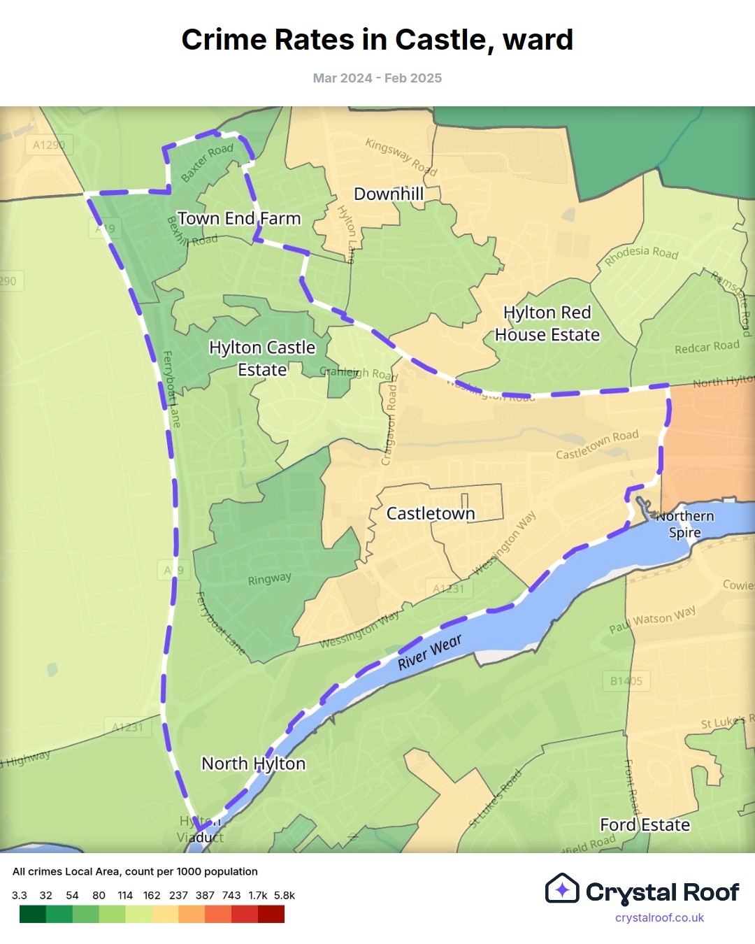 Castle (ward) is located within Sunderland (borough). Annual total crime rate in Sunderland (borough) is 122 crimes per thousand resident population, which can be rated as 6 out of 10 or medium crime level compared to other local authority districts in England and Wales.