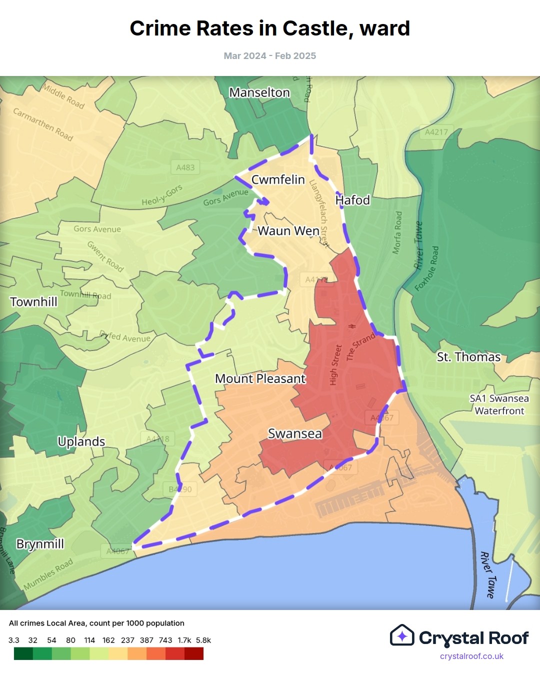 Castle (ward) is located within Swansea (borough). Annual total crime rate in Swansea (borough) is 94.9 crimes per thousand resident population, which can be rated as 4 out of 10 or low crime level compared to other local authority districts in England and Wales.