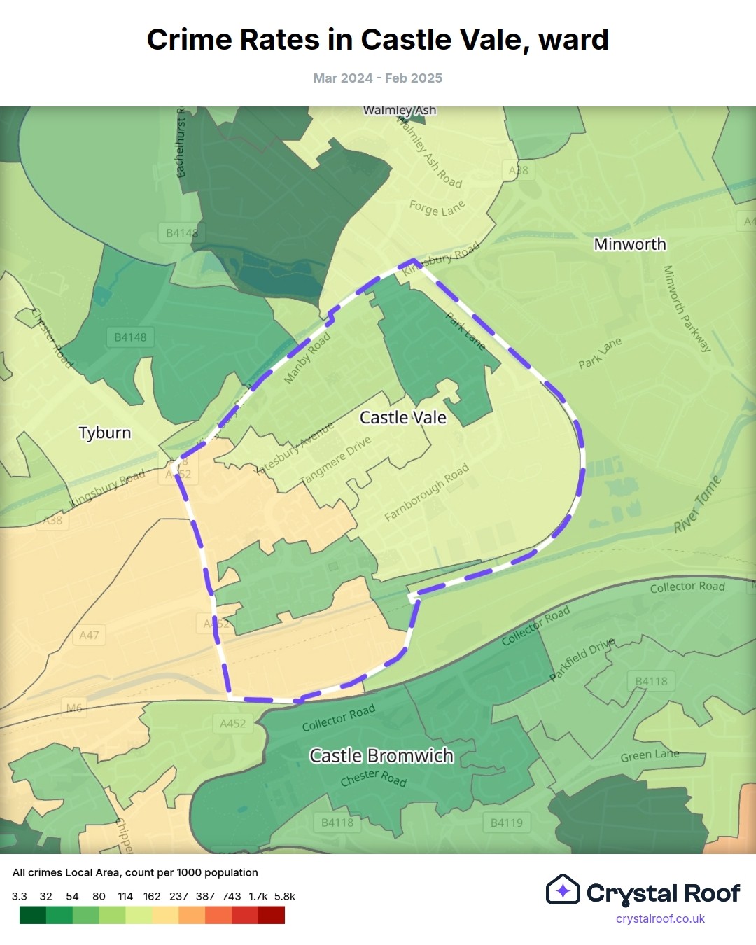 Castle Vale, (ward) includes areas with the following crime ratings (see map):