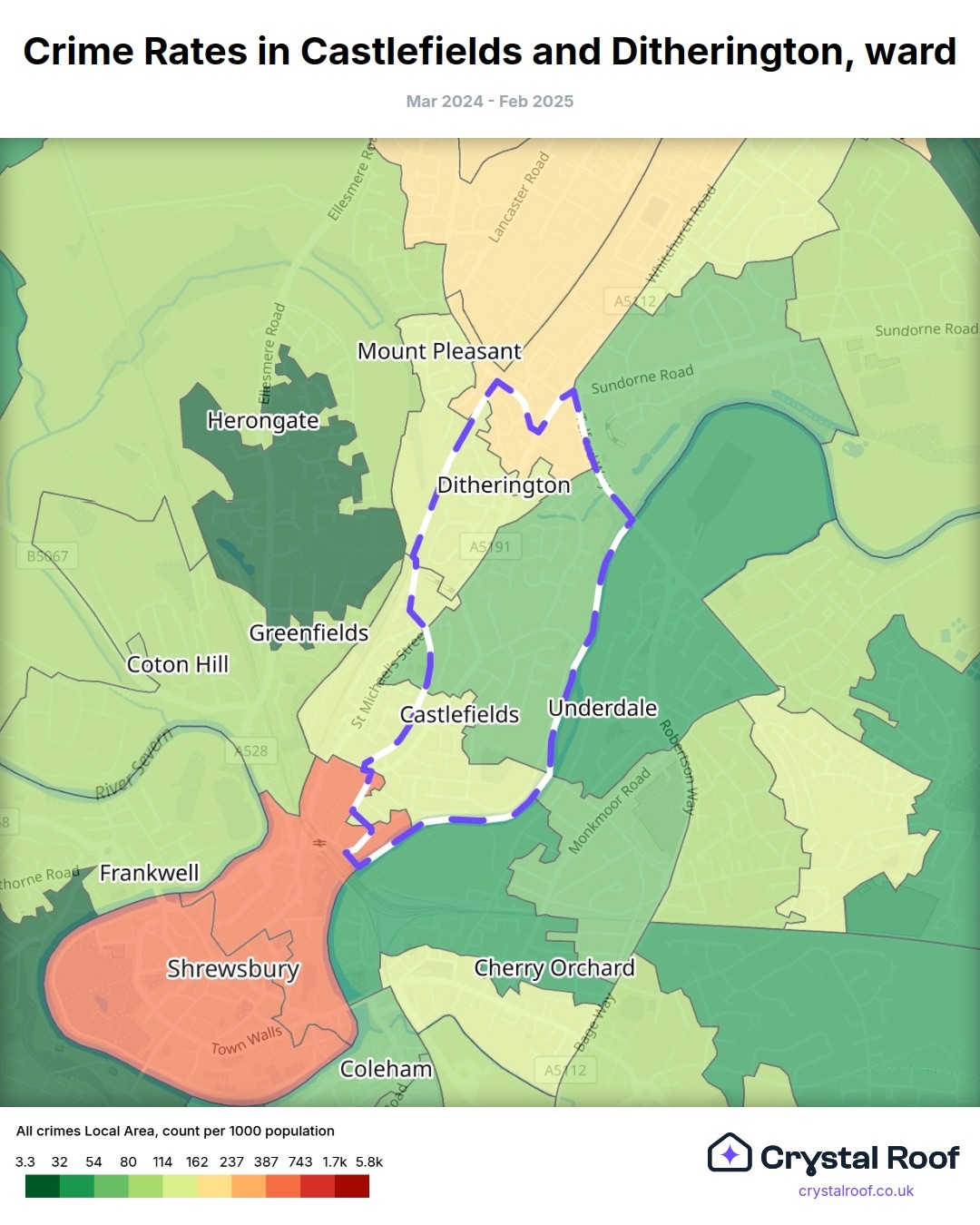 Castlefields & Ditherington, (ward) includes areas with the following crime ratings (see map):