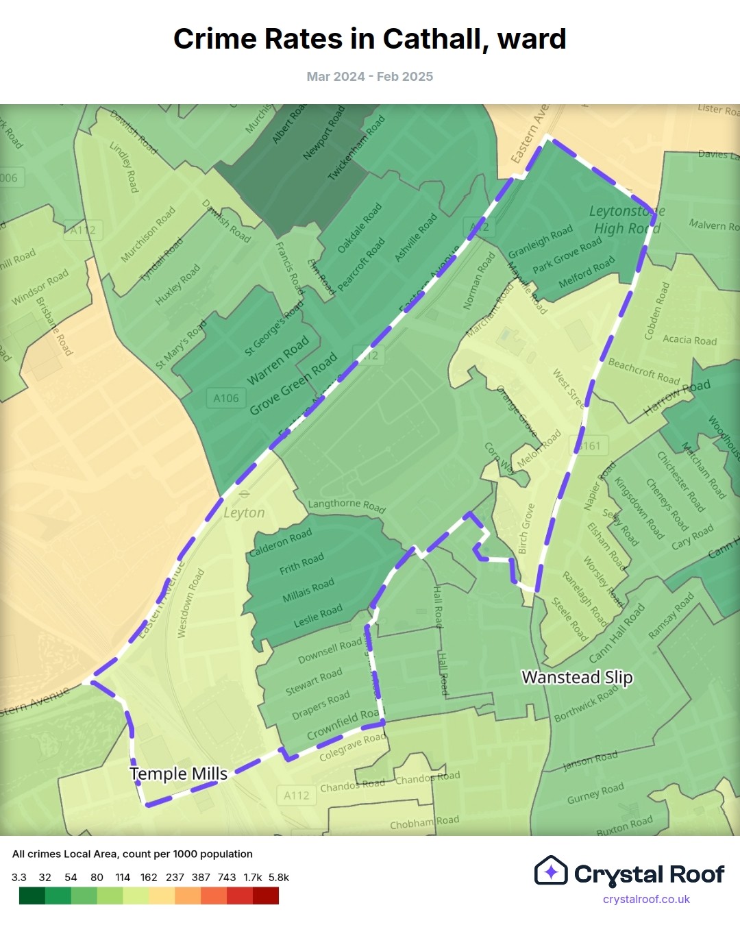 Cathall (ward) is located within Waltham Forest (borough). Annual total crime rate in Waltham Forest (borough) is 110 crimes per thousand resident population, which can be rated as 5 out of 10 or medium crime level compared to other local authority districts in England and Wales.