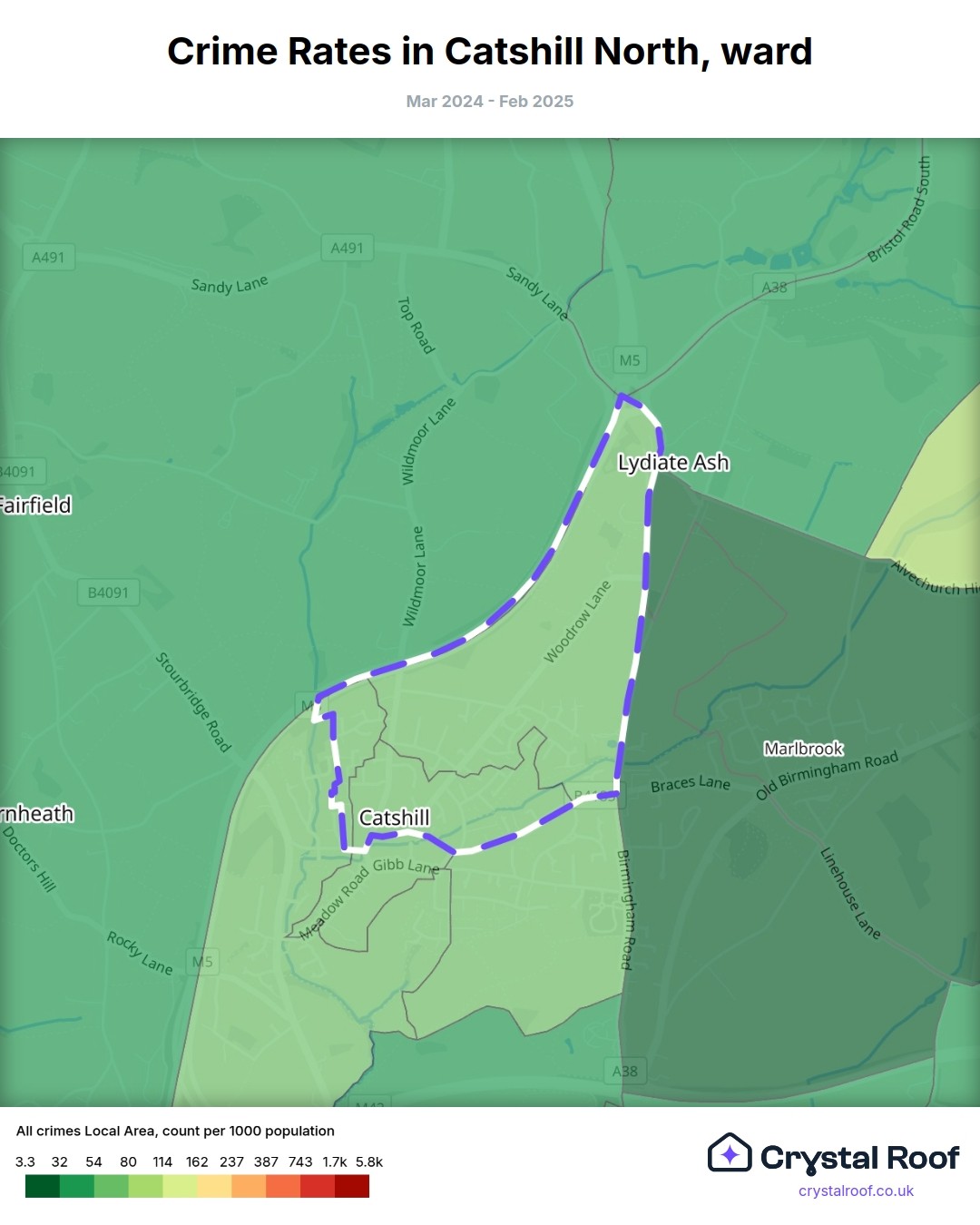 The figures in grey indicate the relative ratings of Catshill North (ward) for a specific crime type compared to other wards in England and Wales.