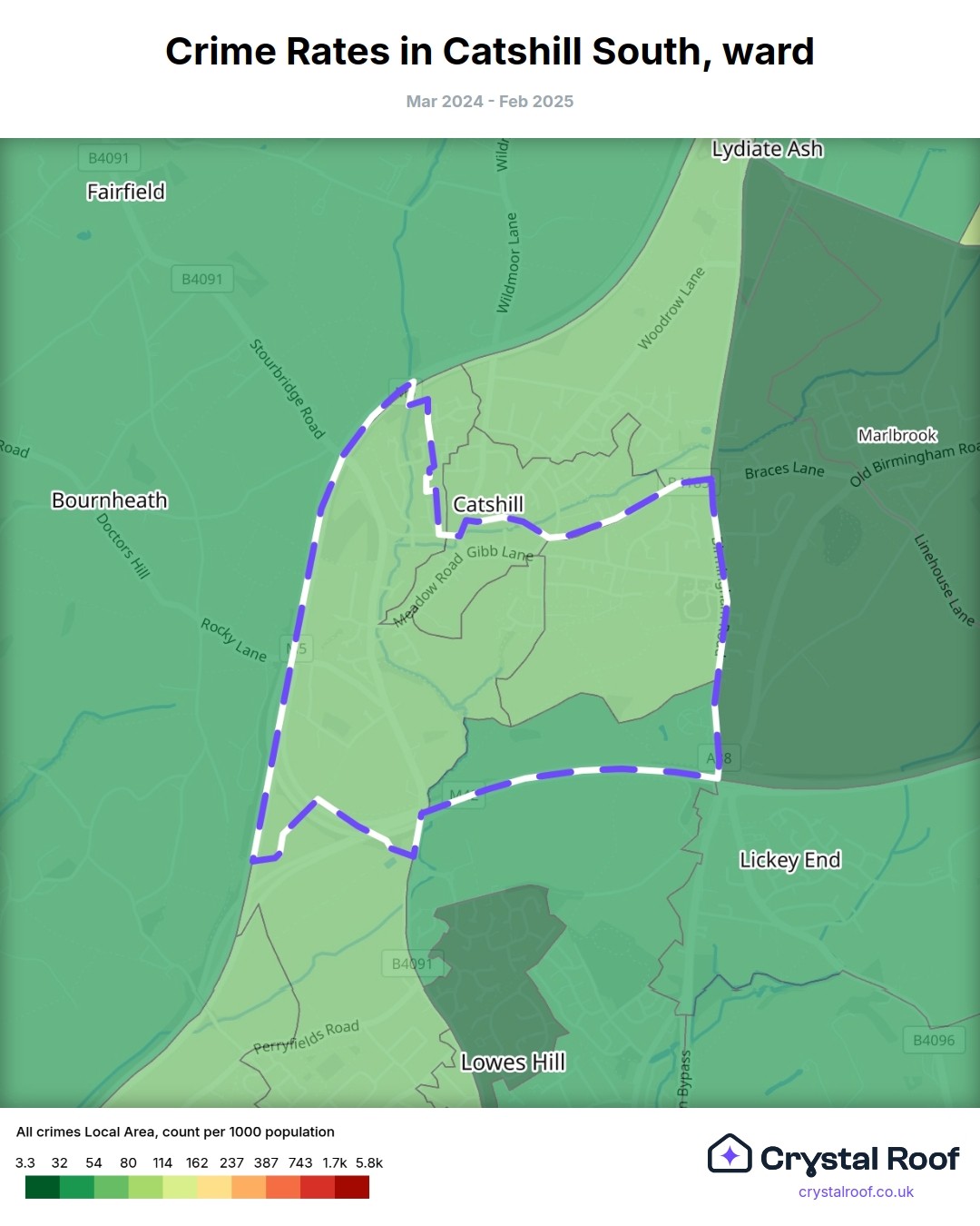 Catshill South, (ward) includes areas with the following crime ratings (see map):