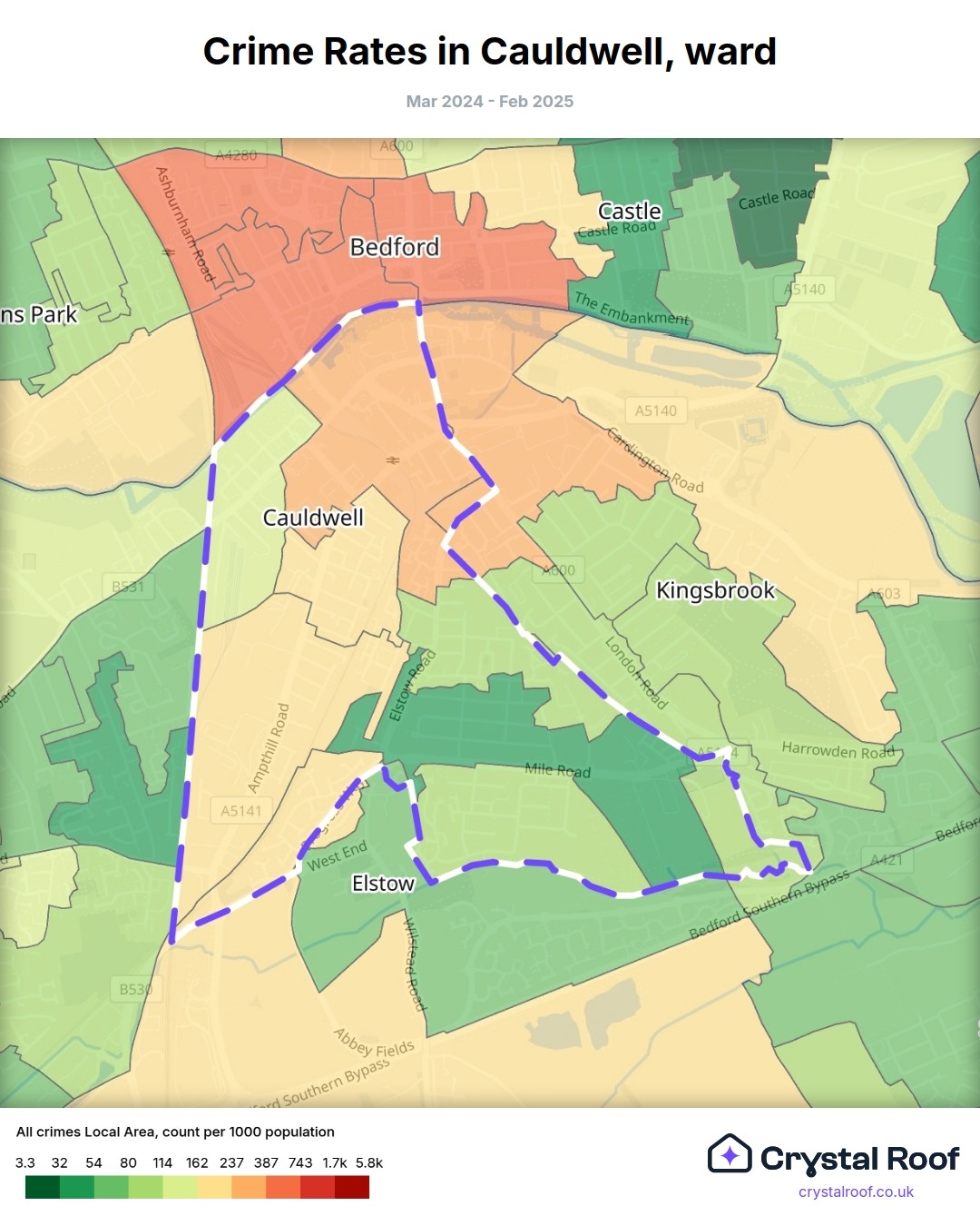 Cauldwell (ward) is located within Bedford (borough). Annual total crime rate in Bedford (borough) is 96.2 crimes per thousand resident population, which can be rated as 4 out of 10 or low crime level compared to other local authority districts in England and Wales.