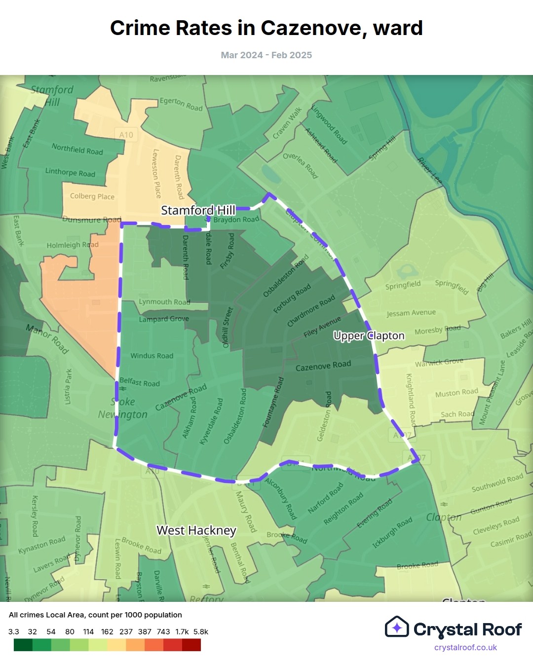 Cazenove (ward) is located within Hackney (borough). Annual total crime rate in Hackney (borough) is 155 crimes per thousand resident population, which can be rated as 7 out of 10 or high crime level compared to other local authority districts in England and Wales.