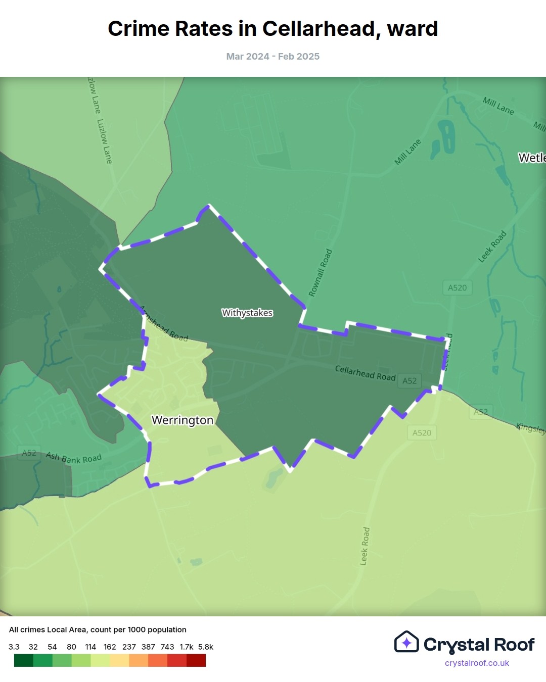 Cellarhead (ward) is located within Staffordshire Moorlands (borough). Annual total crime rate in Staffordshire Moorlands (borough) is 67.1 crimes per thousand resident population, which can be rated as 2 out of 10 or low crime level compared to other local authority districts in England and Wales.