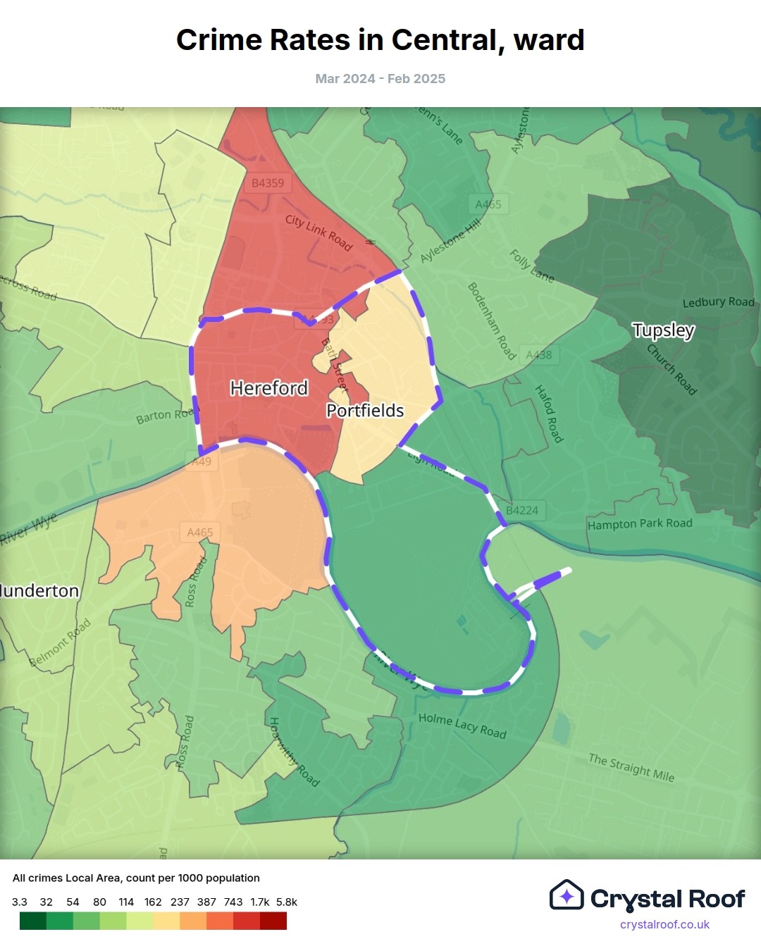 Central (ward) is located within Herefordshire, County of (borough). Annual total crime rate in Herefordshire, County of (borough) is 63.5 crimes per thousand resident population, which can be rated as 2 out of 10 or low crime level compared to other local authority districts in England and Wales.