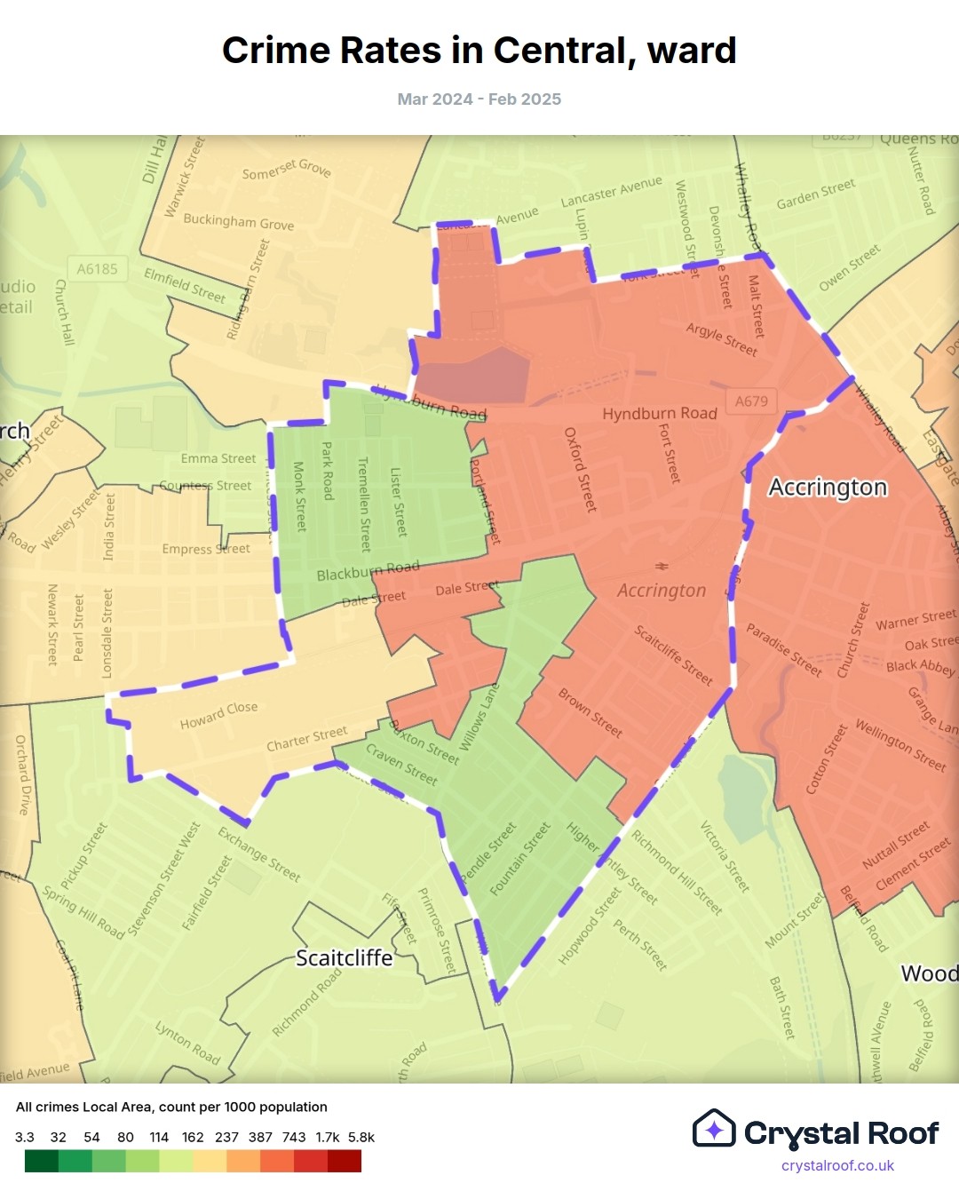 Central (ward) is located within Hyndburn (borough). Annual total crime rate in Hyndburn (borough) is 141 crimes per thousand resident population, which can be rated as 7 out of 10 or high crime level compared to other local authority districts in England and Wales.