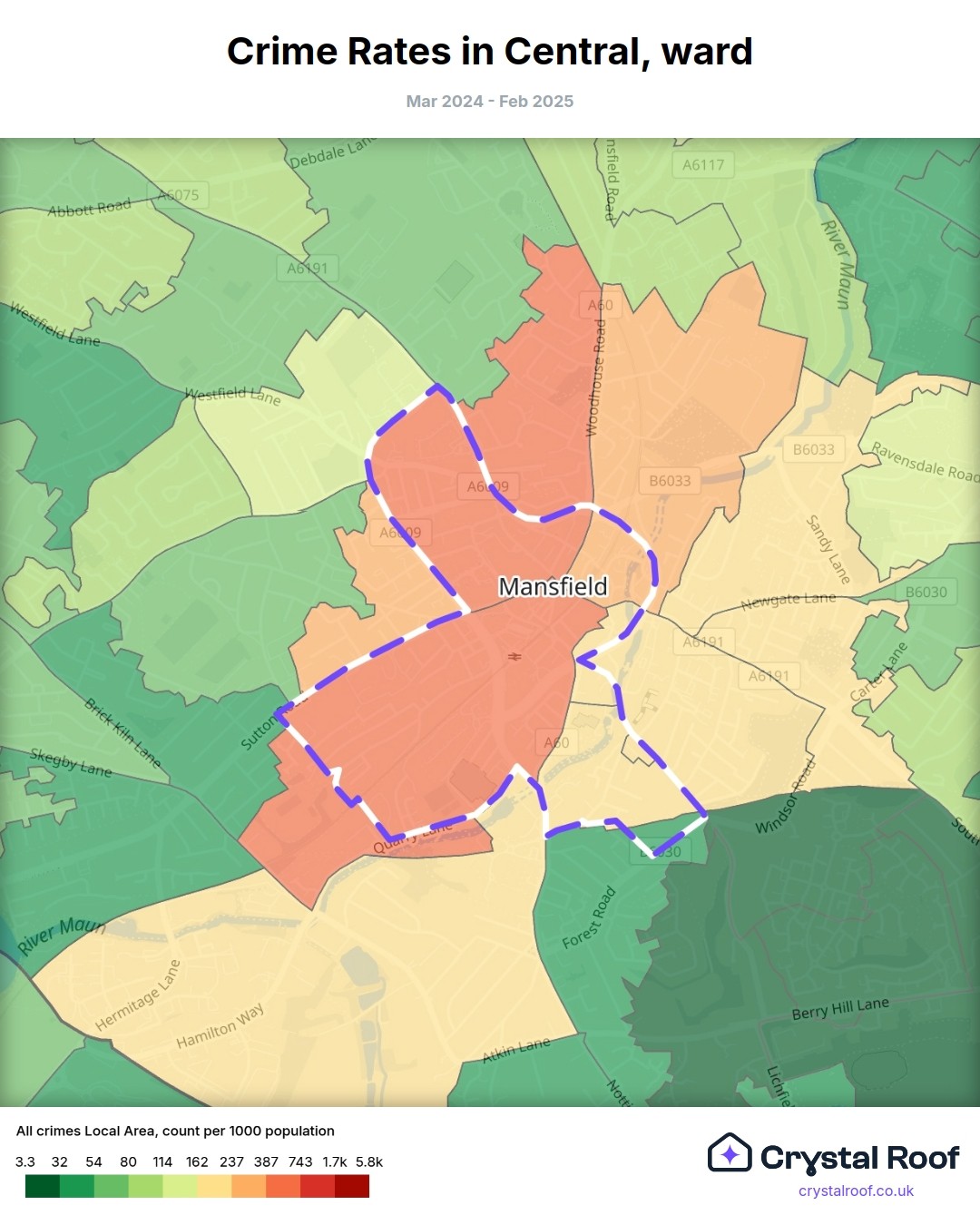 Central (ward) is located within Mansfield (borough). Annual total crime rate in Mansfield (borough) is 114 crimes per thousand resident population, which can be rated as 5 out of 10 or medium crime level compared to other local authority districts in England and Wales.