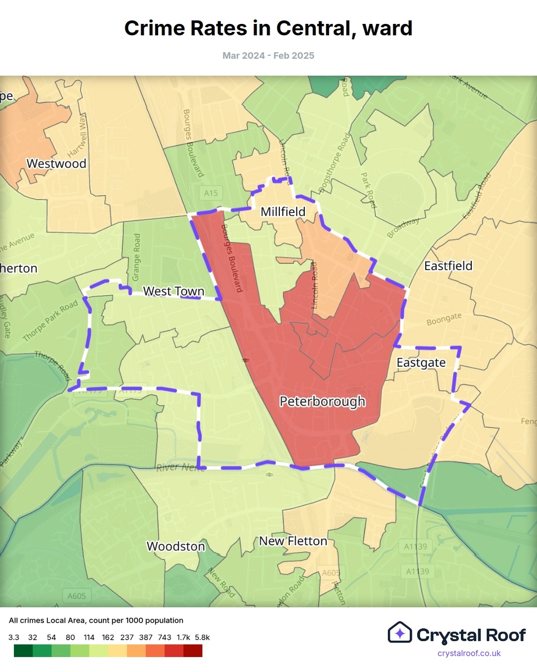 Central (ward) is located within Peterborough (borough). Annual total crime rate in Peterborough (borough) is 129 crimes per thousand resident population, which can be rated as 6 out of 10 or medium crime level compared to other local authority districts in England and Wales.