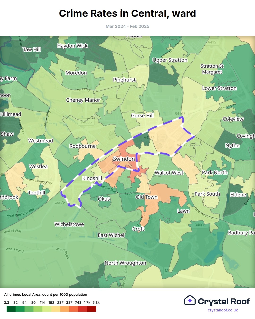 Central (ward) is located within Swindon (borough). Annual total crime rate in Swindon (borough) is 86.5 crimes per thousand resident population, which can be rated as 4 out of 10 or low crime level compared to other local authority districts in England and Wales.