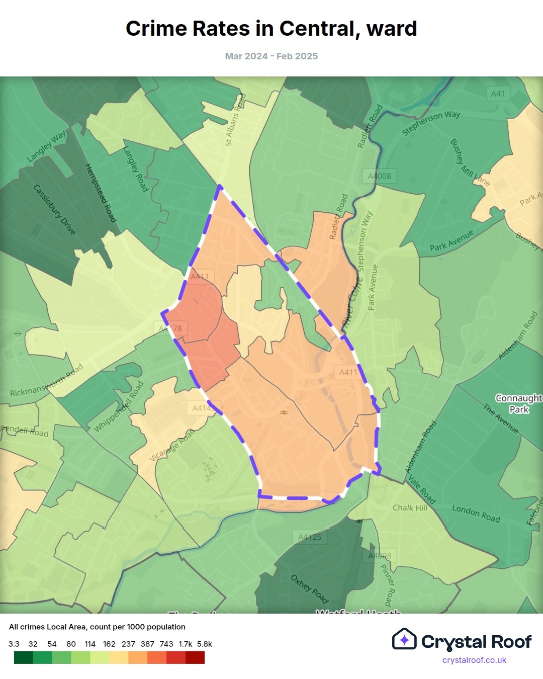 Central (ward) is located within Watford (borough). Annual total crime rate in Watford (borough) is 113 crimes per thousand resident population, which can be rated as 5 out of 10 or medium crime level compared to other local authority districts in England and Wales.