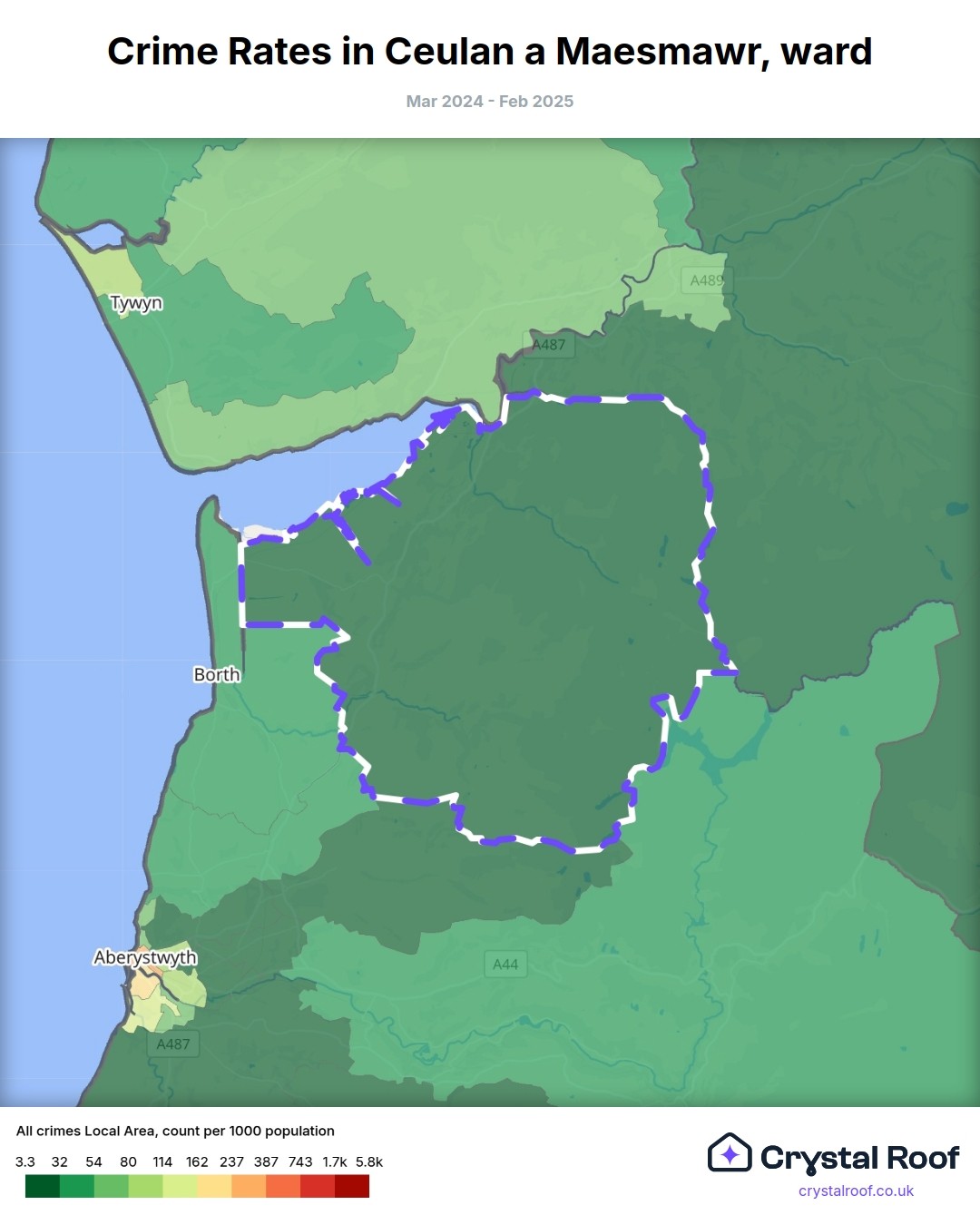 Ceulan a Maesmawr (ward) is located within Ceredigion (borough). Annual total crime rate in Ceredigion (borough) is 68.5 crimes per thousand resident population, which can be rated as 2 out of 10 or low crime level compared to other local authority districts in England and Wales.