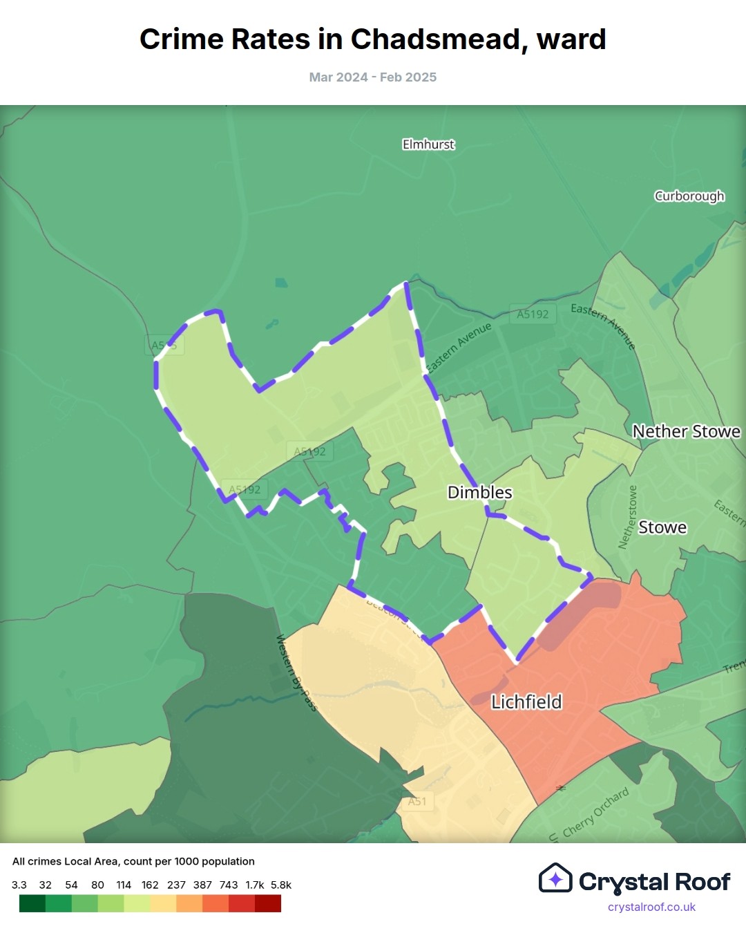 Chadsmead (ward) is located within Lichfield (borough). Annual total crime rate in Lichfield (borough) is 66.4 crimes per thousand resident population, which can be rated as 2 out of 10 or low crime level compared to other local authority districts in England and Wales.