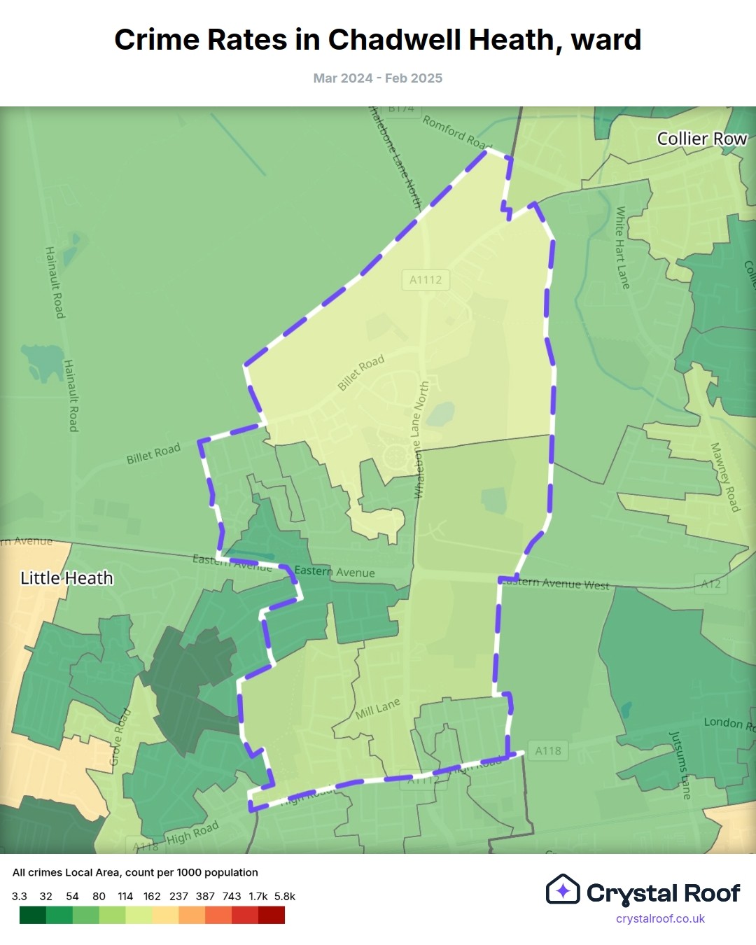 Chadwell Heath, (ward) includes areas with the following crime ratings (see map):