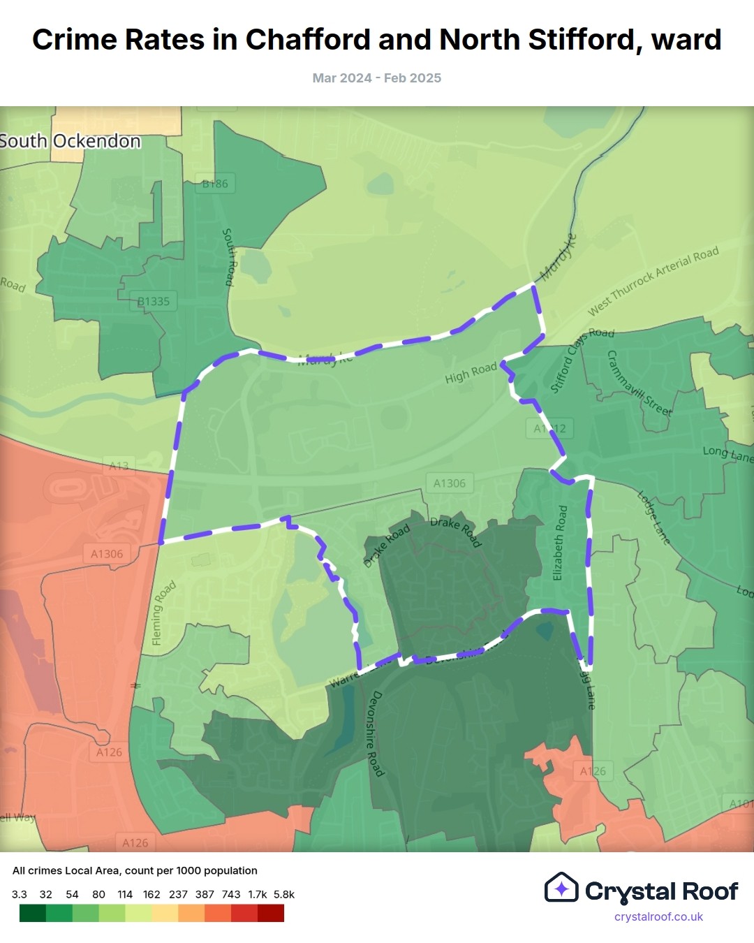 Chafford and North Stifford, (ward) includes areas with the following crime ratings (see map):