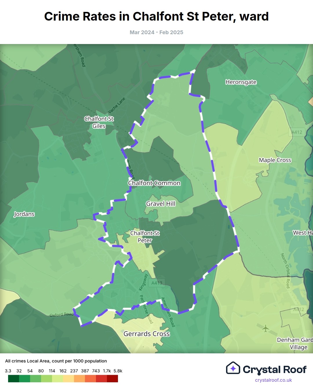 Chalfont St Peter, (ward) includes areas with the following crime ratings (see map):